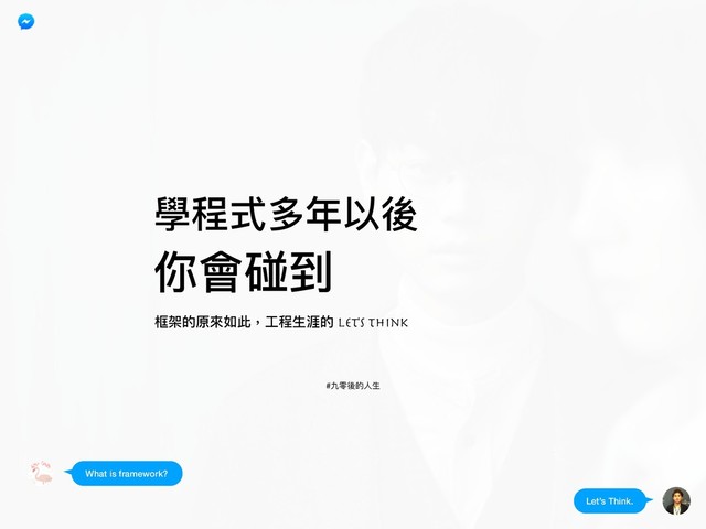 學程式多年年以後 你會碰到 框架的原來來如此,⼯工程⽣生涯的 Let's think #九零後的⼈人⽣生 Let’s Think. What is
