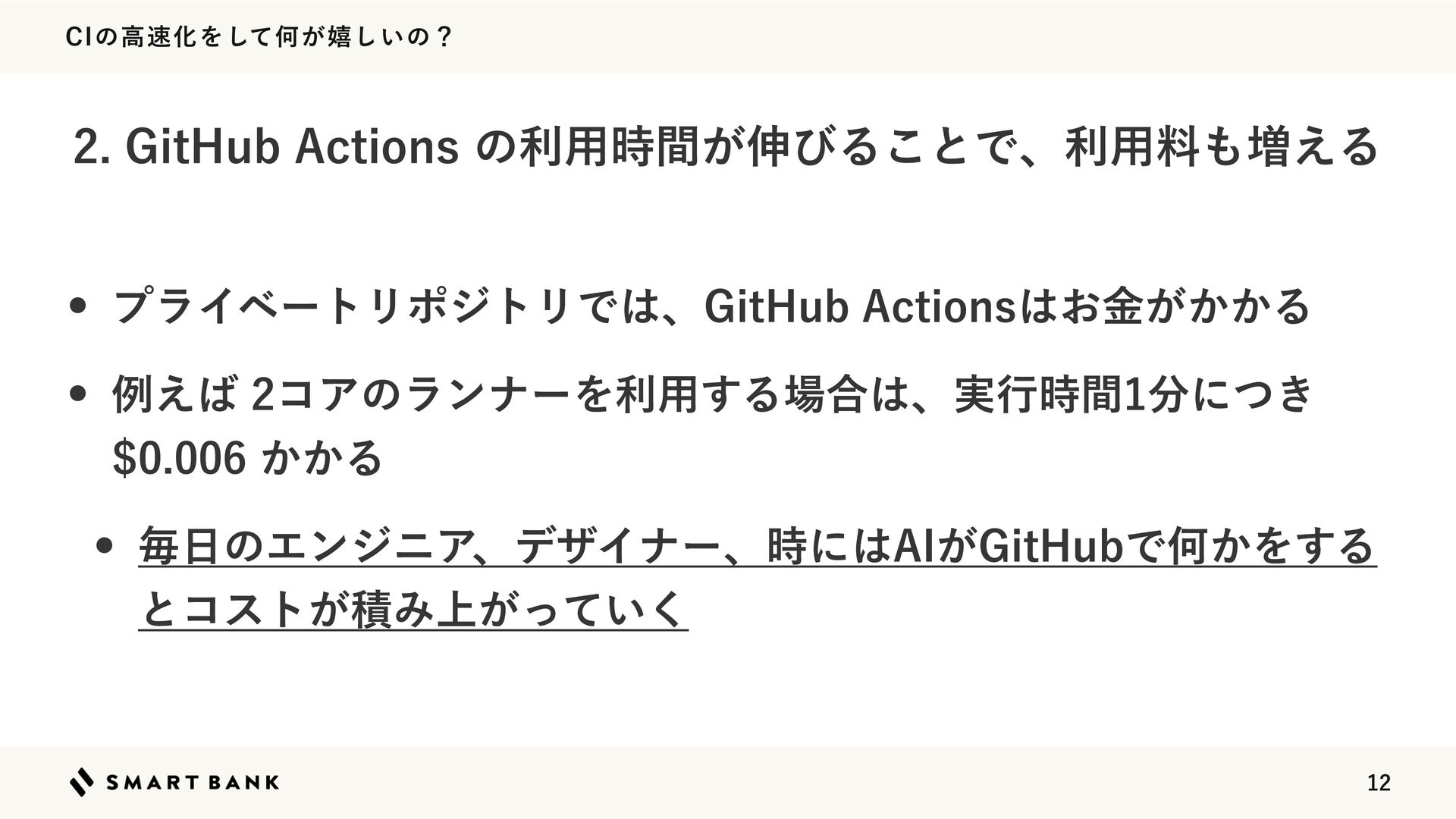 $*ͷߴԽΛͯ͠Կ͕خ͍͠ͷʁ w ϓϥΠϕʔτϦϙδτϦͰɺ(JU)VC"DUJPOT͓͕͔͔ۚΔ w ྫ͑ίΞͷϥϯφʔΛར༻͢Δ߹ɺ࣮ߦ࣌ؒʹ͖ͭ ͔͔Δ w ຖͷΤϯδχΞɺσβΠφʔɺ࣌ʹ"*͕(JU)VCͰԿ͔Λ͢Δ ͱίετ͕ੵΈ্͕͍ͬͯ͘