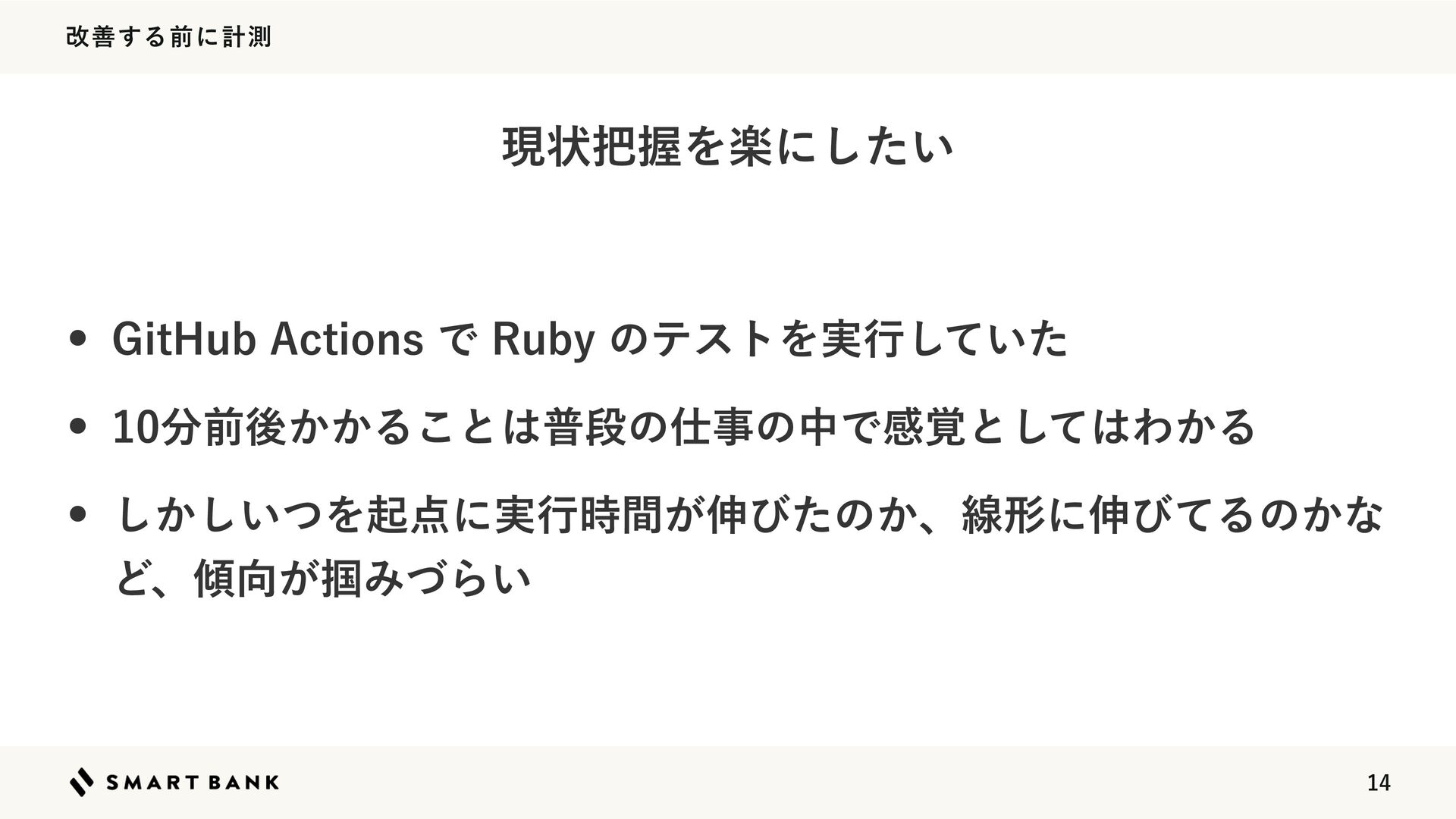 վળ͢Δલʹܭଌ w (JU)VC"DUJPOTͰ3VCZͷςετΛ࣮ߦ͍ͯͨ͠ w લޙ͔͔Δ͜ͱීஈͷࣄͷதͰײ֮ͱͯ͠Θ͔Δ w ͔͍ͭ͠͠Λىʹ࣮ߦ͕࣌ؒ৳ͼͨͷ͔ɺઢܗʹ৳ͼͯΔͷ͔ͳ Ͳɺ͕௫ΈͮΒ͍ ݱঢ়ѲΛָʹ͍ͨ͠