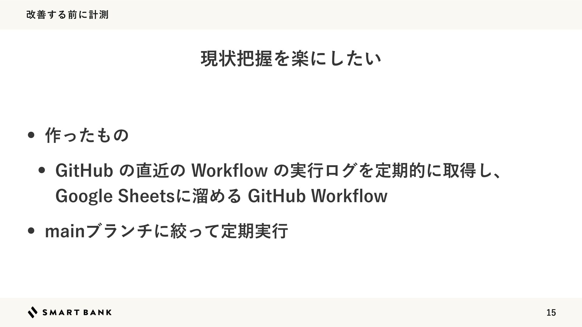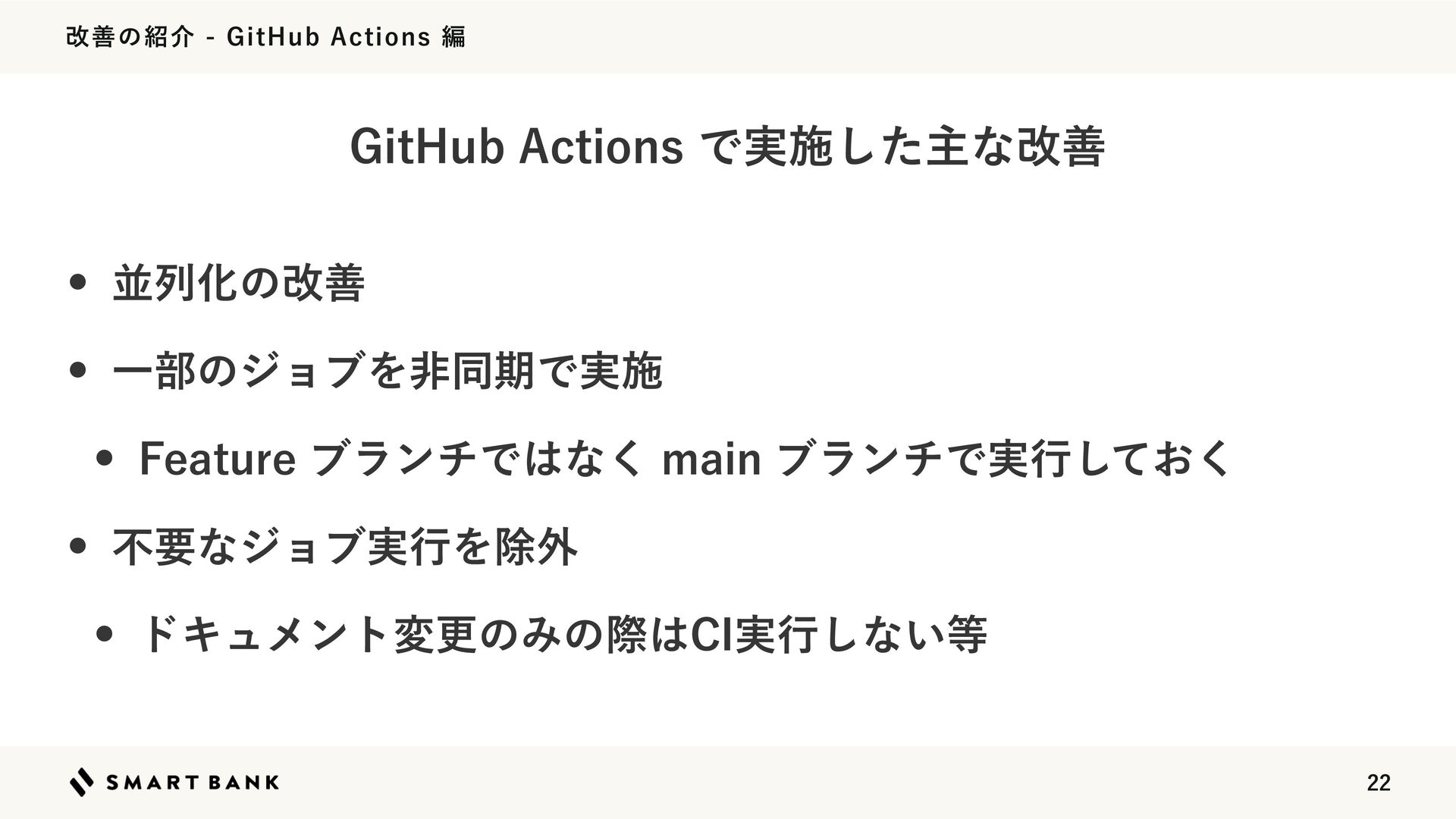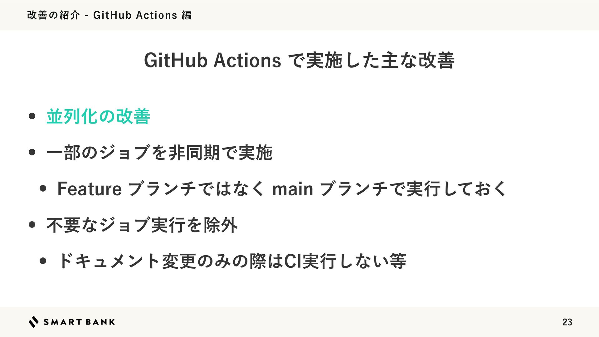 վળͷհ(JU)VC"DUJPOTฤ w ฒྻԽͷվળ w Ұ෦ͷδϣϒΛඇಉظͰ࣮ࢪ w 'FBUVSFϒϥϯνͰͳ͘NBJOϒϥϯνͰ࣮ߦ͓ͯ͘͠ w ෆཁͳδϣϒ࣮ߦΛআ֎