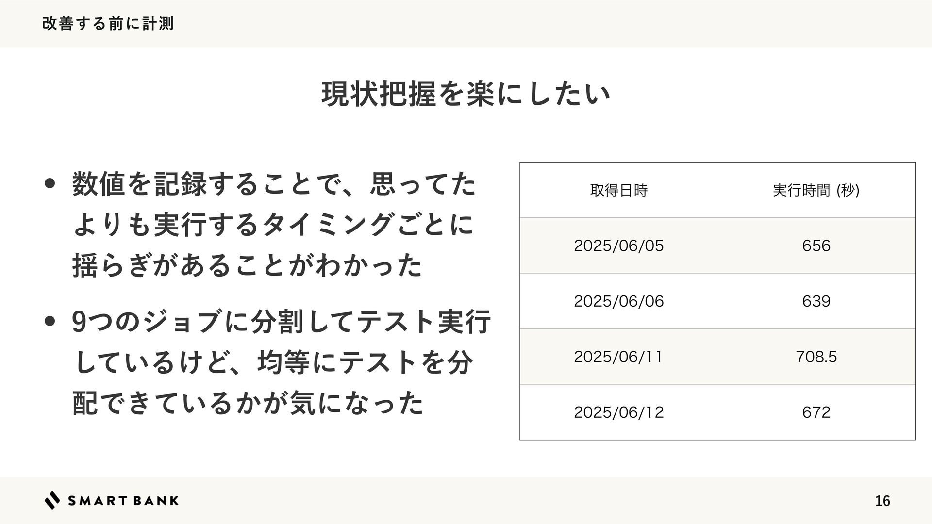 վળ͢Δલʹܭଌ w Λه͢Δ͜ͱͰɺࢥͬͯͨ ΑΓ࣮ߦ͢ΔλΠϛϯά͝ͱʹ ༳Β͕͗͋Δ͜ͱ͕Θ͔ͬͨ w ͭͷδϣϒʹׂͯ͠ςετ࣮ߦ ͍ͯ͠Δ͚ͲɺۉʹςετΛ Ͱ͖͍ͯΔ͔͕ؾʹͳͬͨ