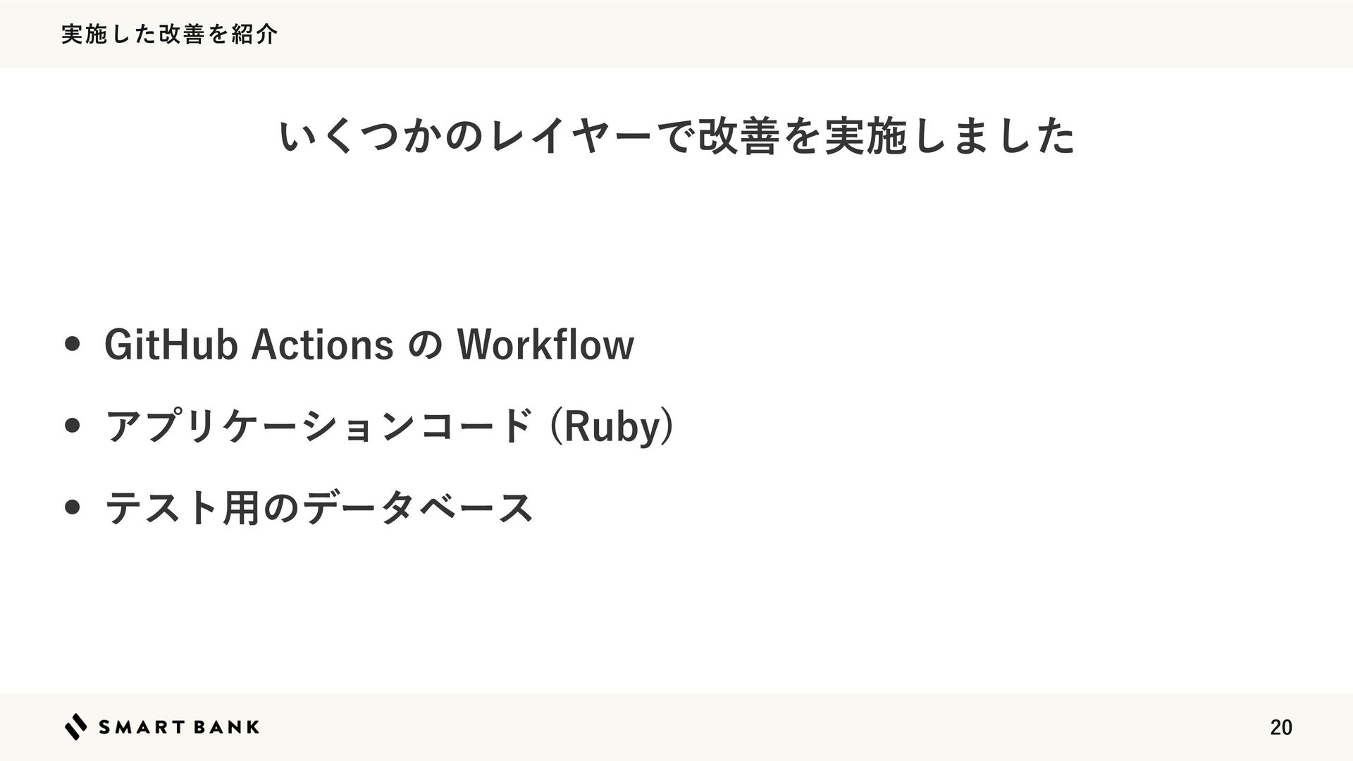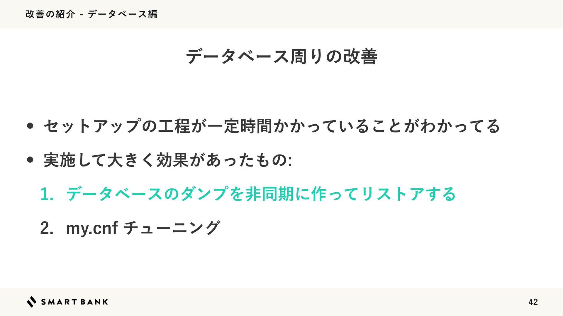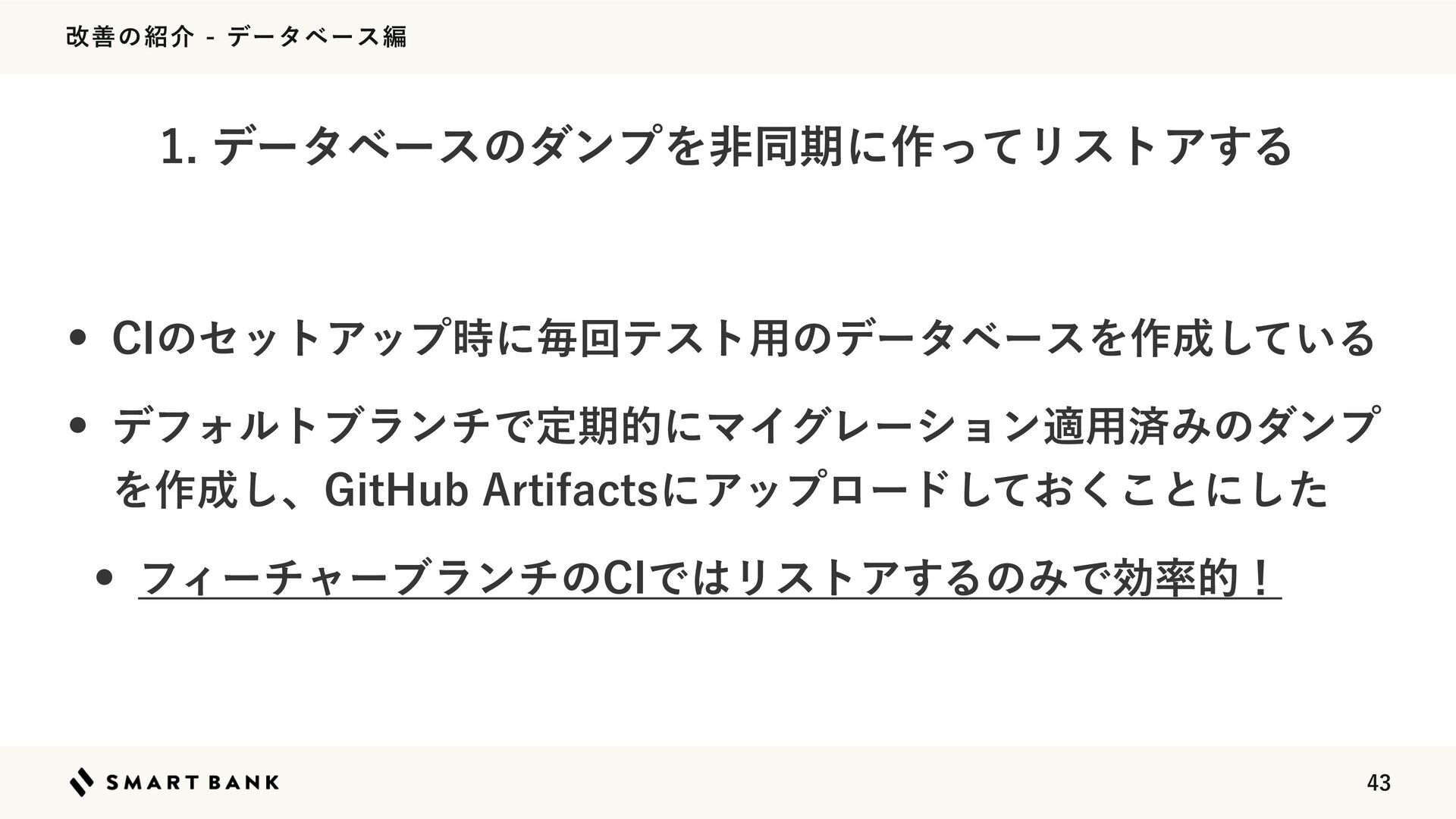վળͷհσʔλϕʔεฤ w $*ͷηοτΞοϓ࣌ʹຖճςετ༻ͷσʔλϕʔεΛ࡞͍ͯ͠Δ w σϑΥϧτϒϥϯνͰఆظతʹϚΠάϨʔγϣϯద༻ࡁΈͷμϯϓ Λ࡞͠ɺ(JU)VC"SUJGBDUTʹΞοϓϩʔυ͓ͯ͘͜͠ͱʹͨ͠ w ϑΟʔνϟʔϒϥϯνͷ$*ͰϦετΞ͢ΔͷΈͰޮతʂ σʔλϕʔεͷμϯϓΛඇಉظʹ࡞ͬͯϦετΞ͢Δ