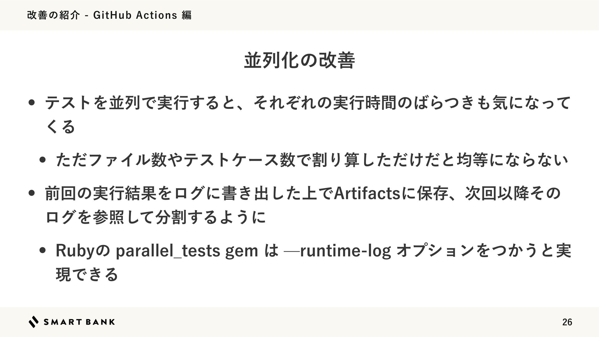վળͷհ(JU)VC"DUJPOTฤ w ςετΛฒྻͰ࣮ߦ͢ΔͱɺͦΕͧΕͷ࣮ߦ࣌ؒͷΒ͖ͭؾʹͳͬͯ ͘Δ w ͨͩϑΝΠϧςετέʔεͰׂΓࢉ͚ͨͩͩ͠ͱۉʹͳΒͳ͍ w લճͷ࣮ߦ݁ՌΛϩάʹॻ͖ग़্ͨ͠Ͱ"SUJGBDUTʹอଘɺ࣍ճҎ߱ͦͷ ϩάΛࢀরׂͯ͢͠ΔΑ͏ʹ