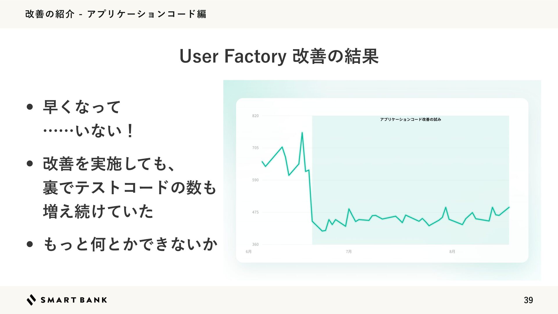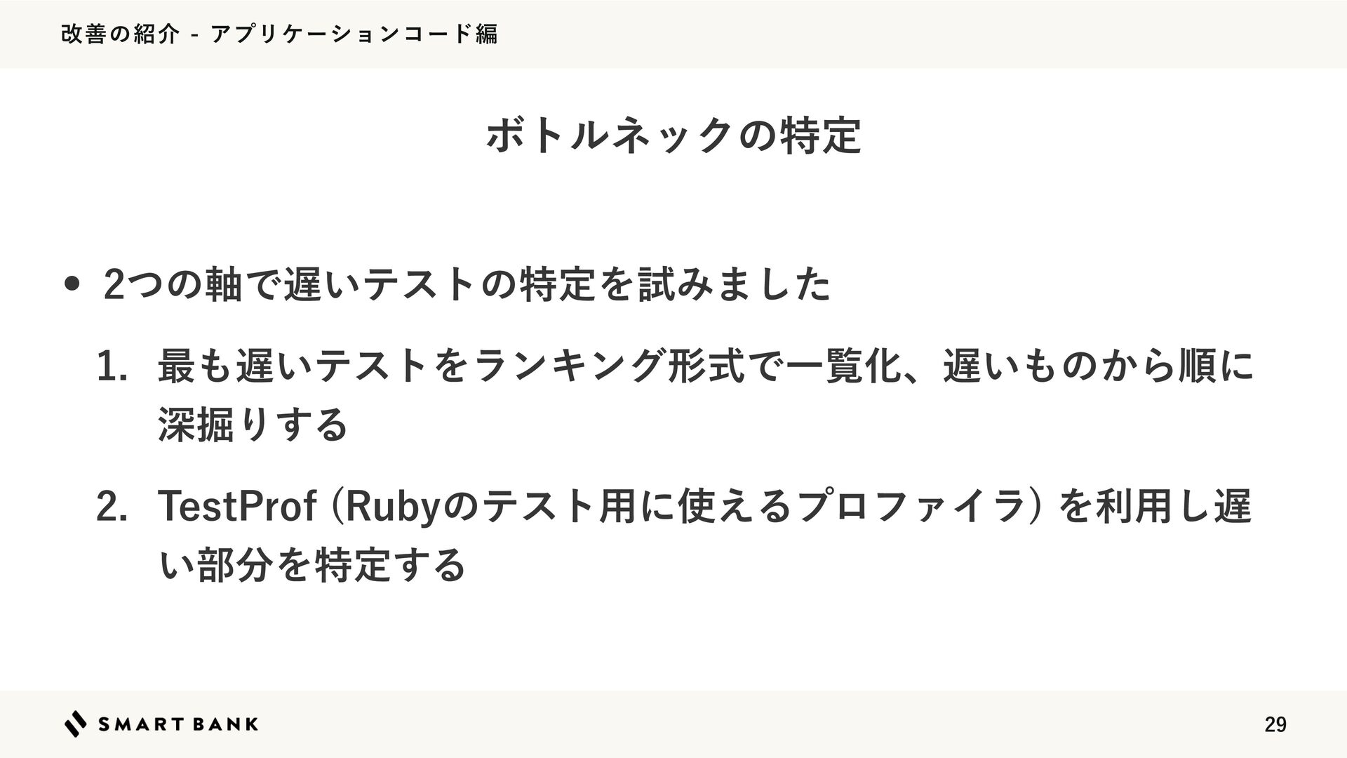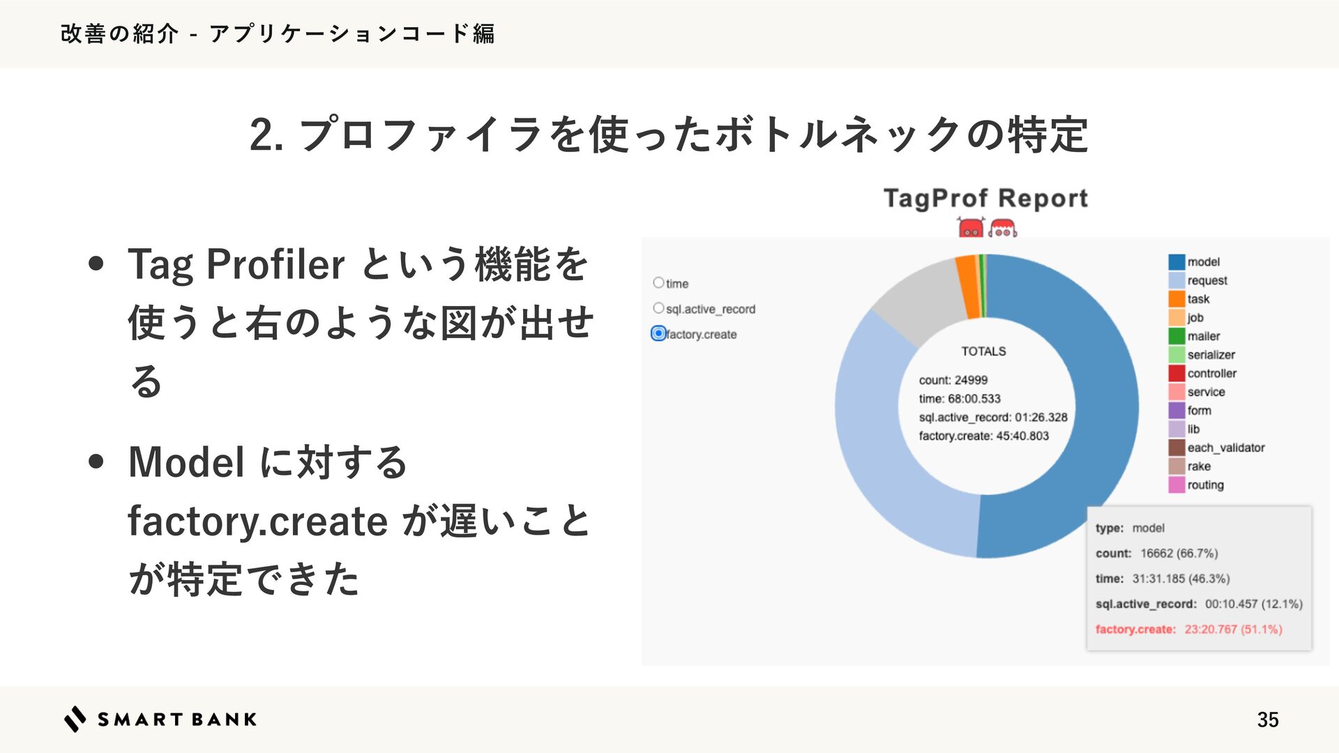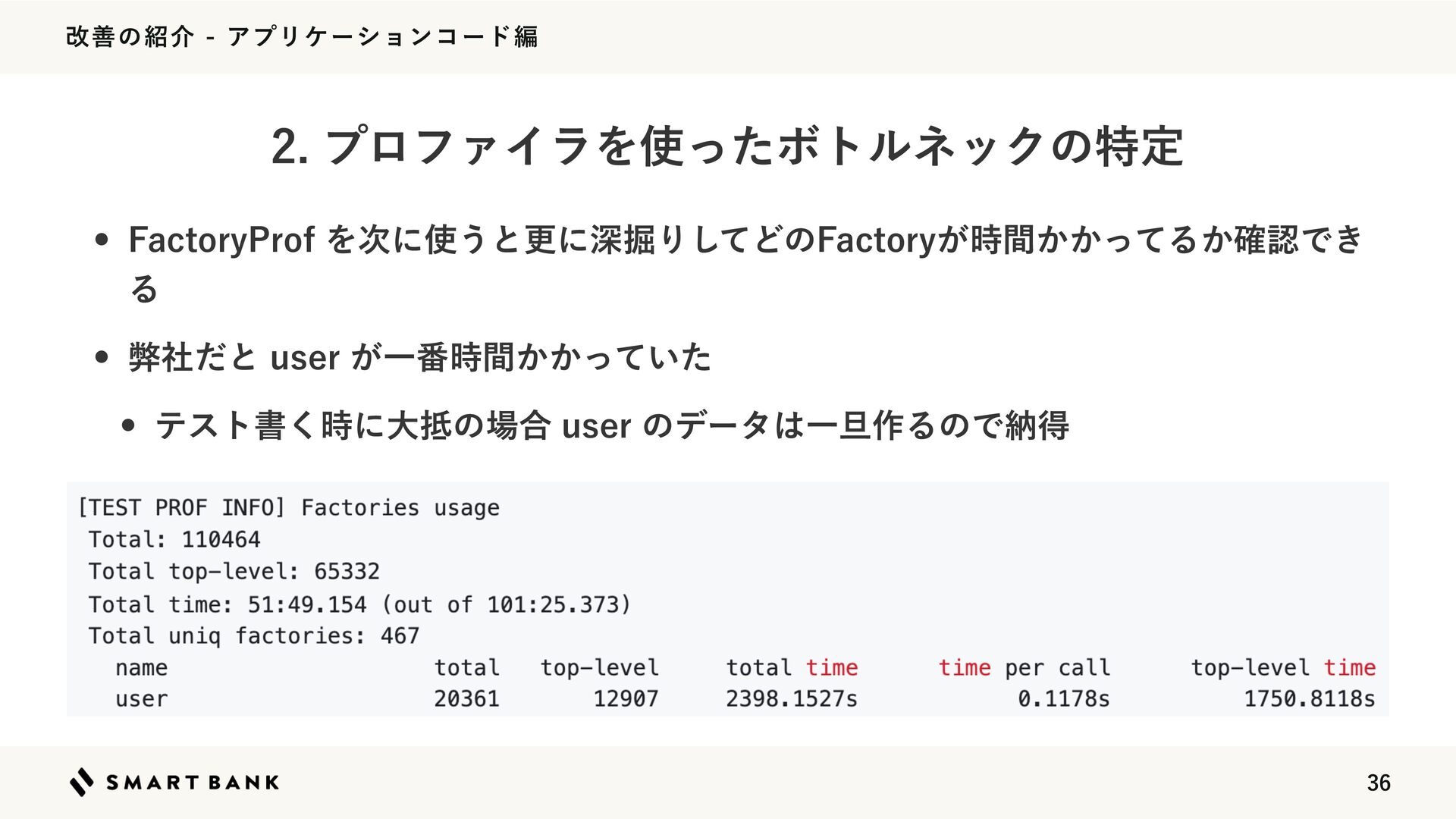 վળͷհΞϓϦέʔγϣϯίʔυฤ w 'BDUPSZ1SPGΛ࣍ʹ͏ͱߋʹਂ۷Γͯ͠Ͳͷ'BDUPSZ͕͔͔࣌ؒͬͯΔ͔֬ೝͰ͖ Δ w ฐࣾͩͱVTFS͕Ұ൪͔͔͍࣌ؒͬͯͨ w ςετॻ࣌͘ʹେͷ߹VTFSͷσʔλҰ୴࡞ΔͷͰೲಘ ϓϩϑΝΠϥΛͬͨϘτϧωοΫͷಛఆ