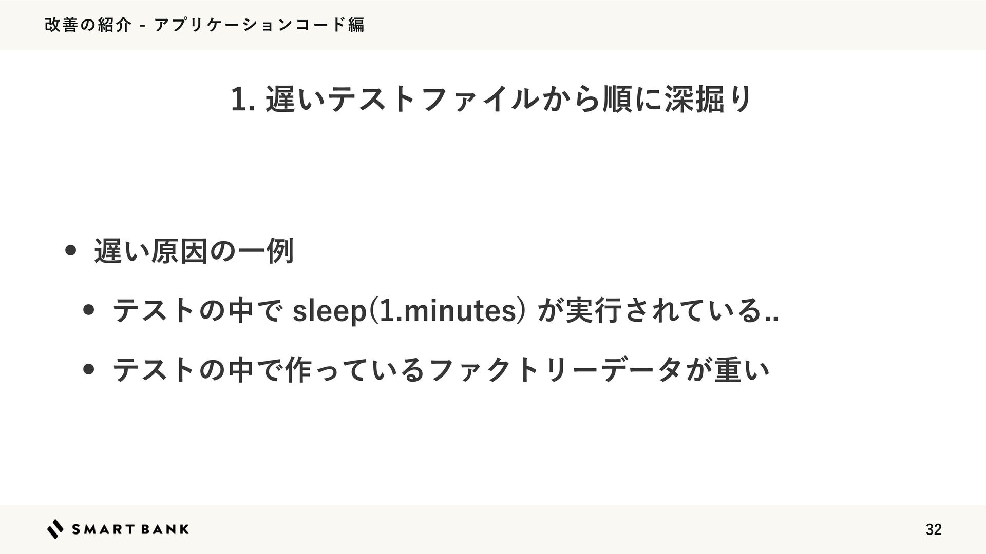 վળͷհΞϓϦέʔγϣϯίʔυฤ w ͍ݪҼͷҰྫ w ςετͷதͰTMFFQ NJOVUFT ͕࣮ߦ͞Ε͍ͯΔ w ςετͷதͰ࡞͍ͬͯΔϑΝΫτϦʔσʔλ͕ॏ͍