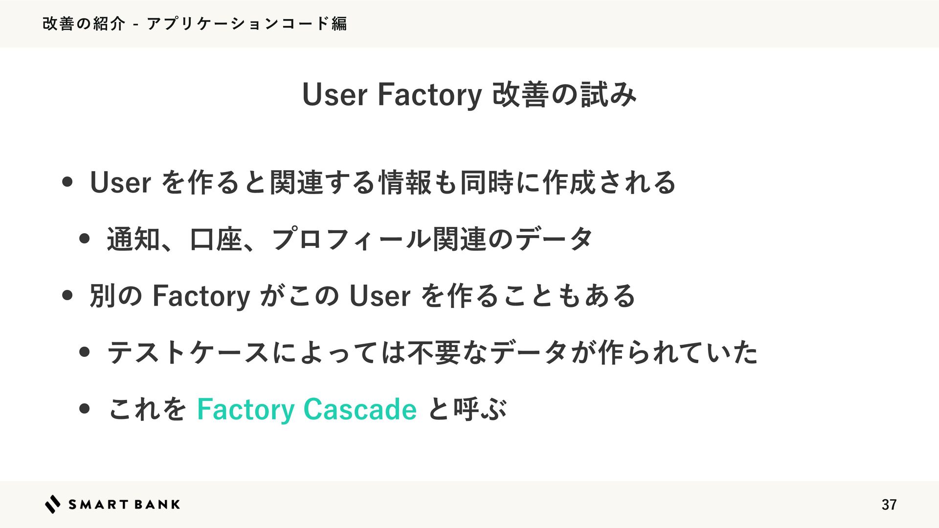 վળͷհΞϓϦέʔγϣϯίʔυฤ 6TFS'BDUPSZվળͷࢼΈ w 6TFSΛ࡞Δͱؔ࿈͢Δใಉ࣌ʹ࡞͞ΕΔ w ௨ɺޱ࠲ɺϓϩϑΟʔϧؔ࿈ͷσʔλ w ผͷ'BDUPSZ͕͜ͷ6TFSΛ࡞Δ͜ͱ͋Δ w