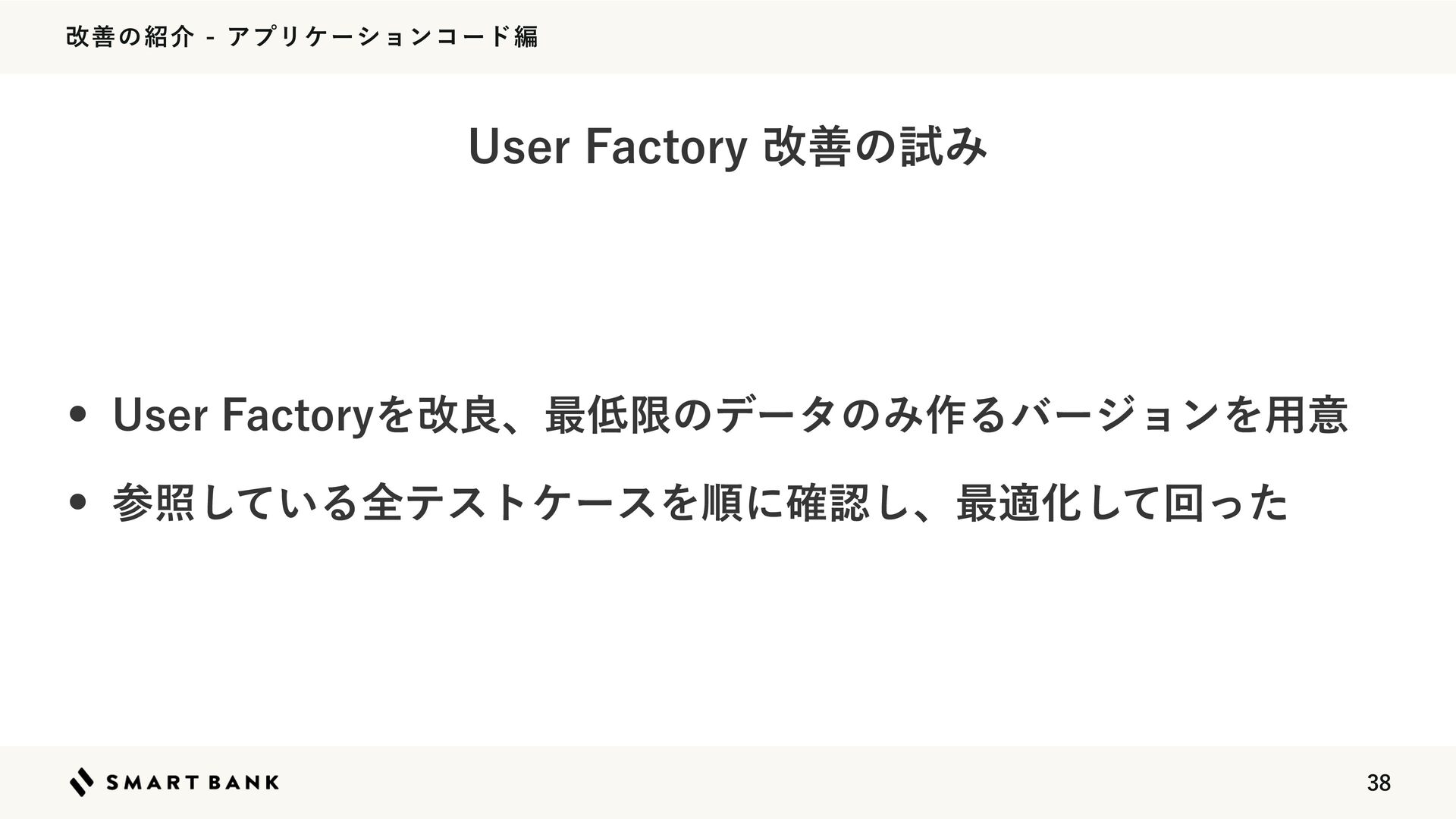վળͷհΞϓϦέʔγϣϯίʔυฤ w 6TFS'BDUPSZΛվྑɺ࠷ݶͷσʔλͷΈ࡞ΔόʔδϣϯΛ༻ҙ w ࢀর͍ͯ͠ΔશςετέʔεΛॱʹ֬ೝ͠ɺ࠷దԽͯ͠ճͬͨ 6TFS'BDUPSZվળͷࢼΈ