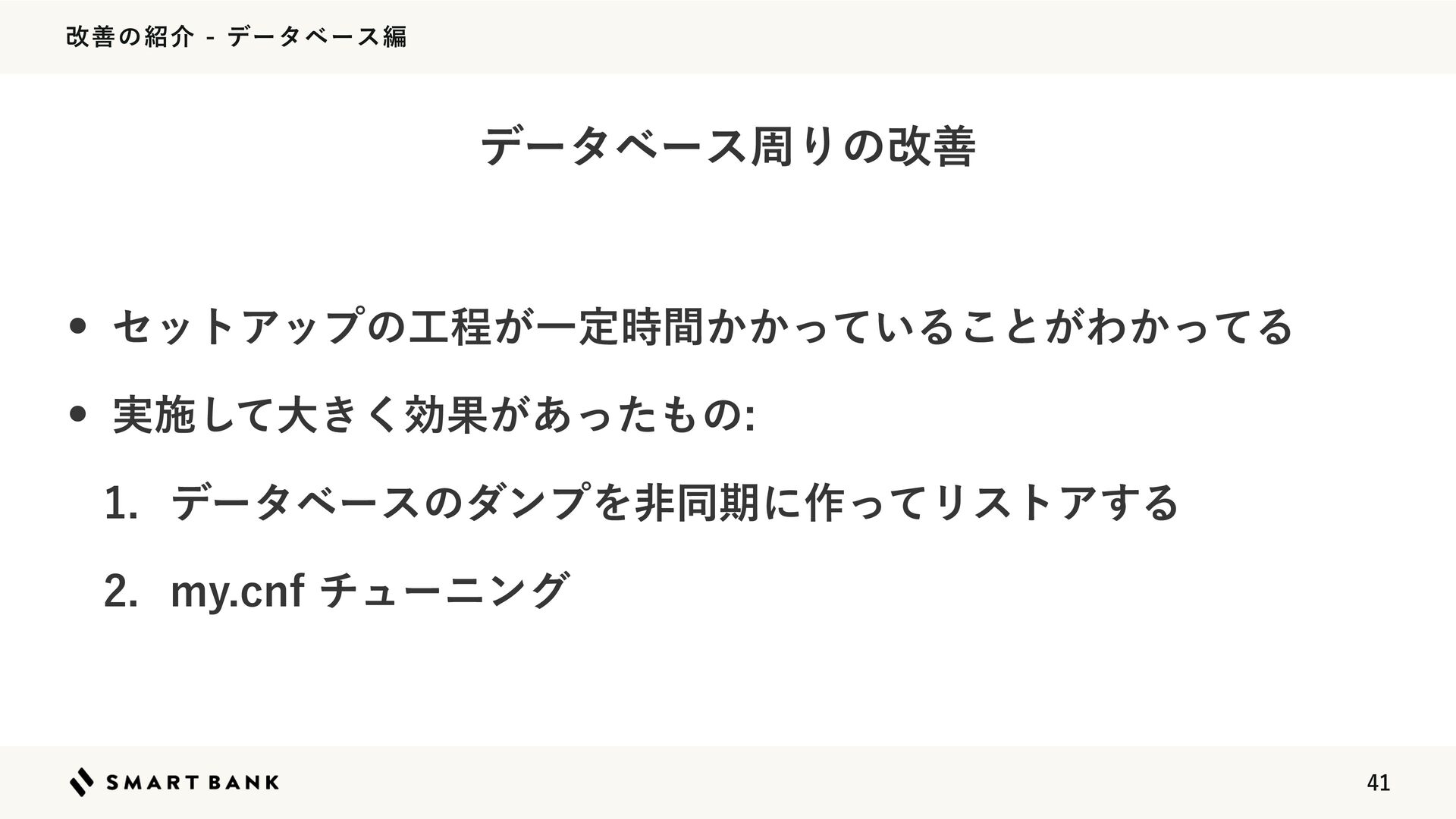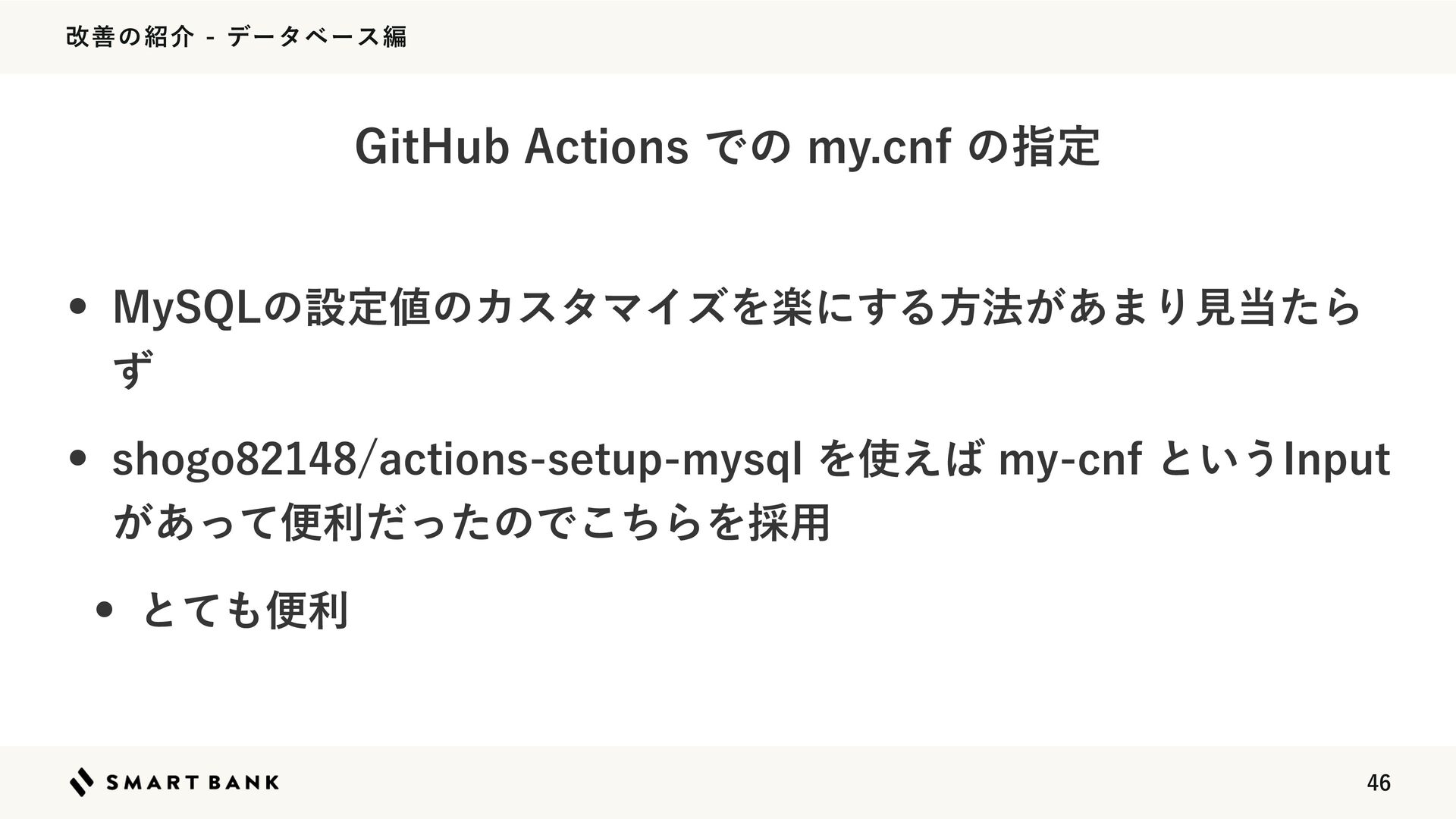 վળͷհσʔλϕʔεฤ w .Z42-ͷઃఆͷΧελϚΠζΛָʹ͢Δํ๏͕͋·ΓݟͨΒ ͣ w TIPHPBDUJPOTTFUVQNZTRMΛ͑NZDOGͱ͍͏*OQVU ͕͋ͬͯศརͩͬͨͷͰͪ͜ΒΛ࠾༻ w ͱͯศར