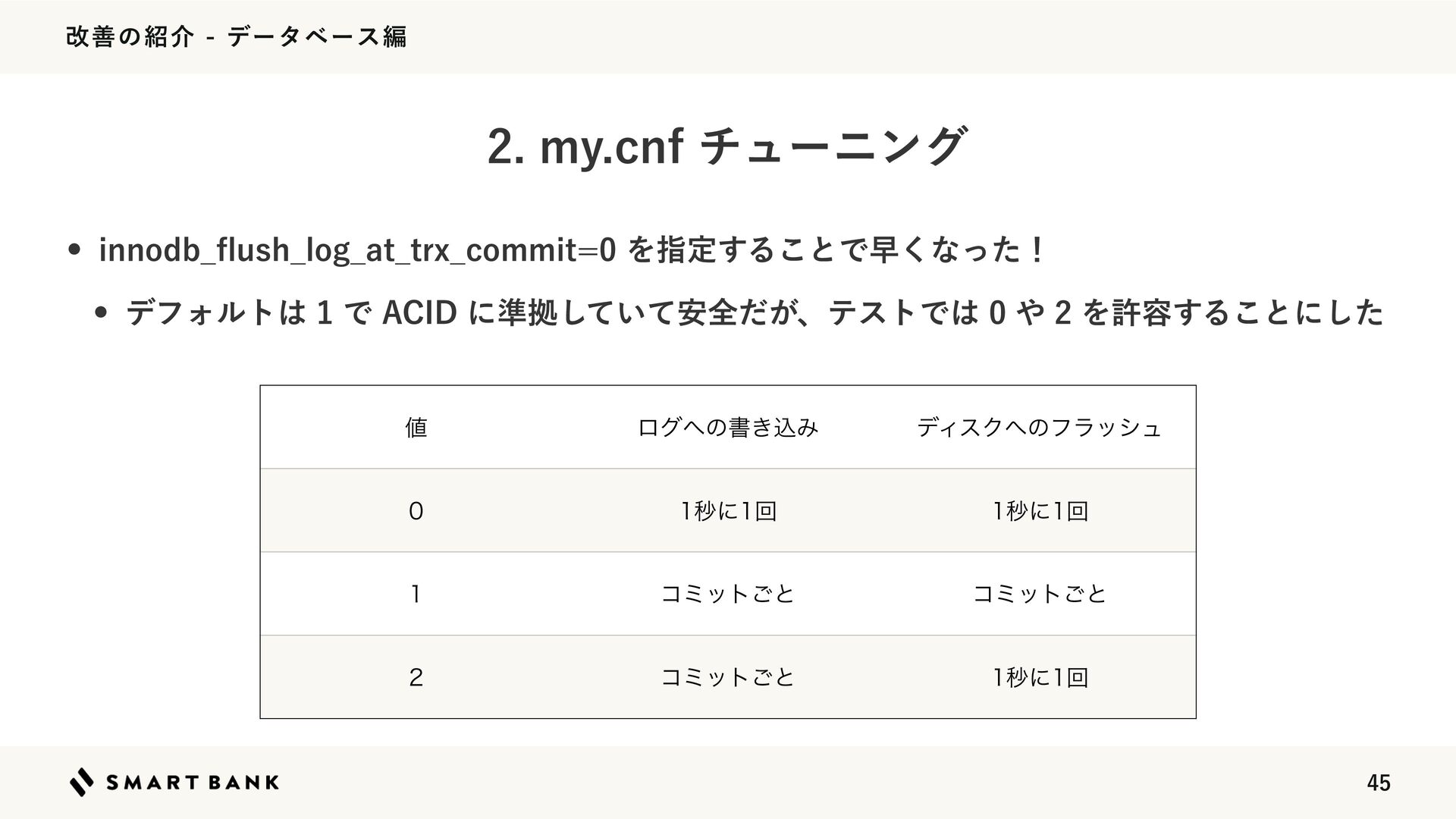 վળͷհσʔλϕʔεฤ w JOOPEC@ fl VTI@MPH@BU@USY@DPNNJUΛࢦఆ͢Δ͜ͱͰૣ͘ͳͬͨʂ w σϑΥϧτͰ"$*%ʹ४ڌ͍ͯͯ҆͠શ͕ͩɺςετͰΛڐ༰͢Δ͜ͱʹͨ͠ NZDOGνϡʔχϯά