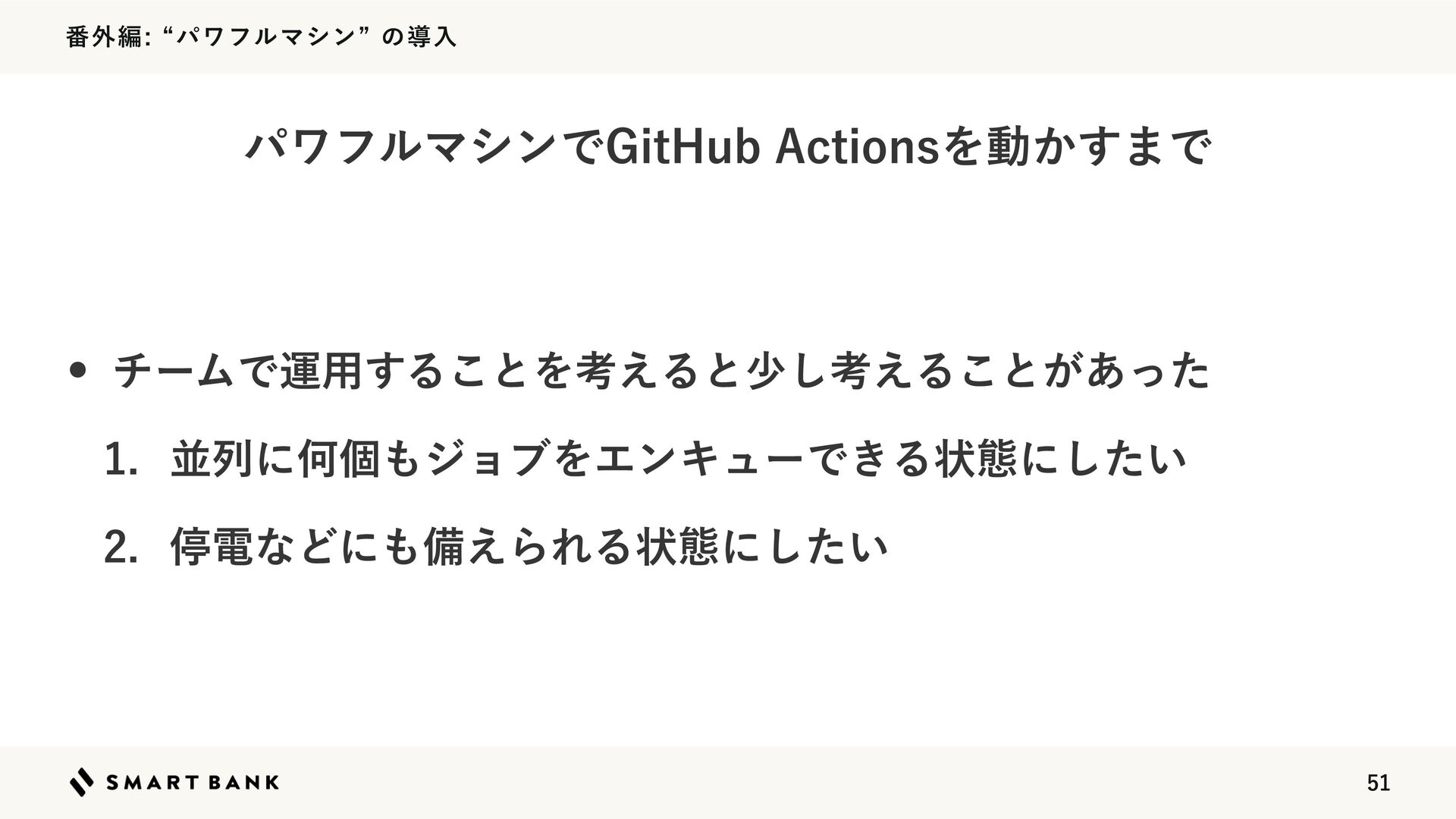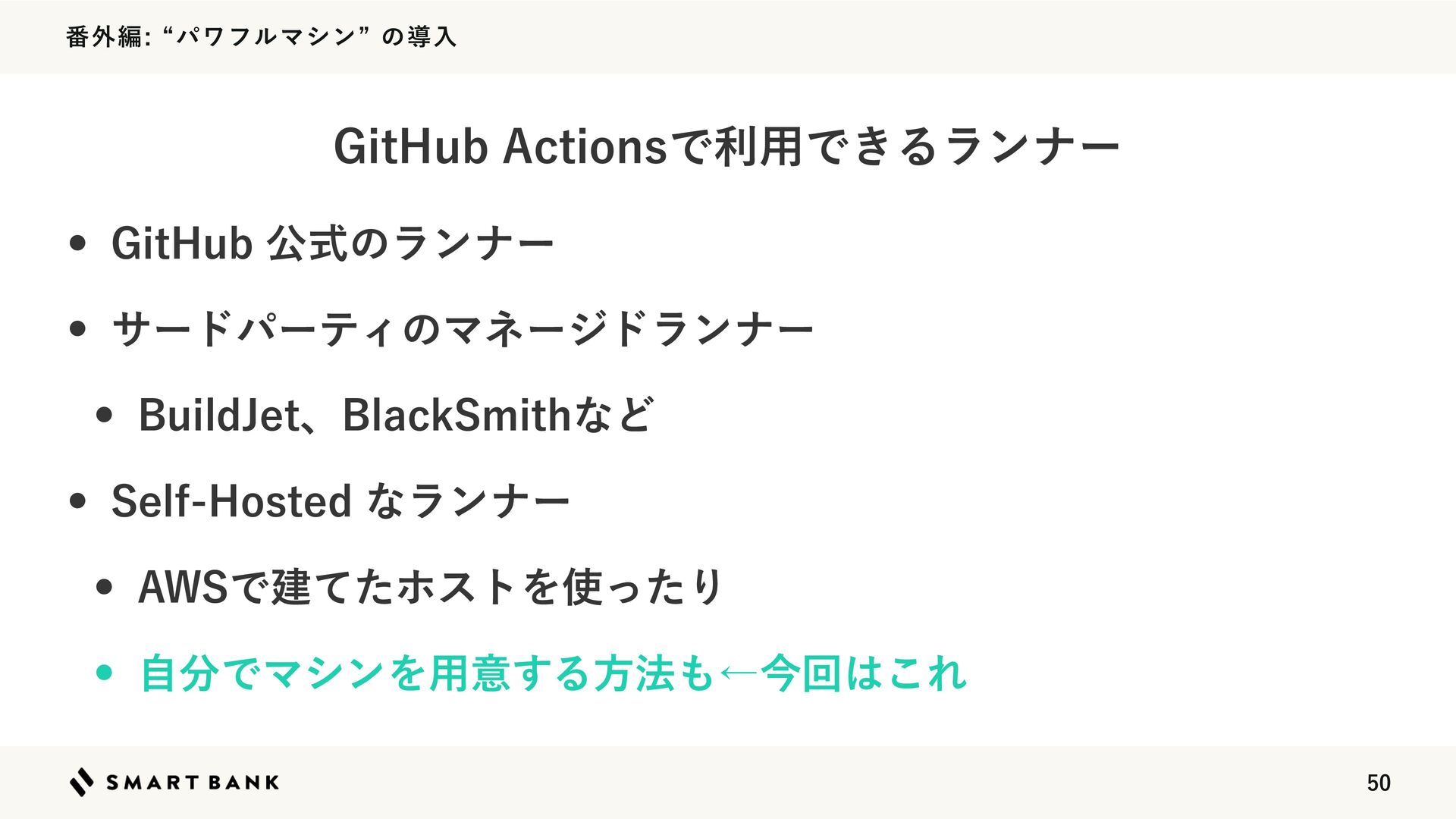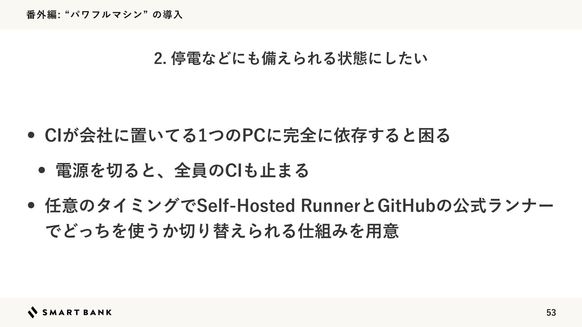 ൪֎ฤlύϫϑϧϚγϯzͷಋೖ w $*͕ձࣾʹஔ͍ͯΔͭͷ1$ʹશʹґଘ͢ΔͱࠔΔ w ిݯΛΔͱɺશһͷ$*ࢭ·Δ w ҙͷλΠϛϯάͰ4FMG)PTUFE3VOOFSͱ(JU)VCͷެࣜϥϯφʔ ͰͲͬͪΛ͏͔Γସ͑ΒΕΔΈΛ༻ҙ ఀిͳͲʹඋ͑ΒΕΔঢ়ଶʹ͍ͨ͠