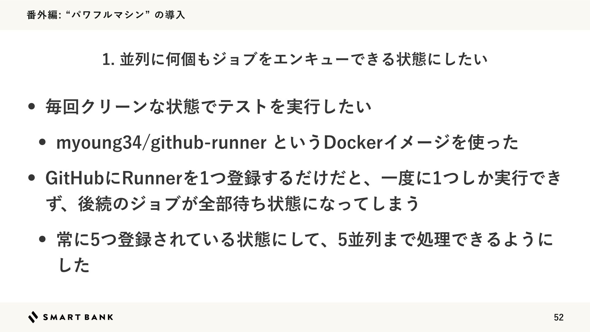 ൪֎ฤlύϫϑϧϚγϯzͷಋೖ w ຖճΫϦʔϯͳঢ়ଶͰςετΛ࣮ߦ͍ͨ͠ w NZPVOHHJUIVCSVOOFSͱ͍͏%PDLFSΠϝʔδΛͬͨ w (JU)VCʹ3VOOFSΛͭొ͢Δ͚ͩͩͱɺҰʹ͔࣮ͭ͠ߦͰ͖ ͣɺޙଓͷδϣϒ͕શ෦ͪঢ়ଶʹͳͬͯ͠·͏ w