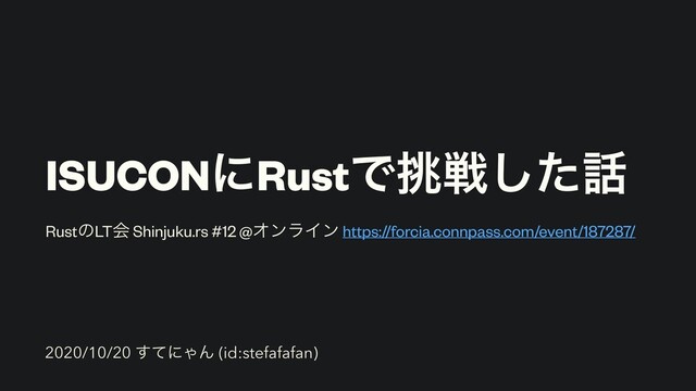User { id: i32, username: String, name: String } async fn user_detail_json() -> imp Responder { let user = User { id: 12345, username: “stefafafan”.to_string(), name: “ͯ͢ʹΌΜ”.to_string(), } // ͜Εactix_webͷ͚ؔͩͲJSONͱͯ͠ฦͤͯΔ HttpResponse::Ok().json(user) } Rust͚ʹσʔλΛSerialize/ Deserialize͢ΔϑϨʔϜϫʔΫ https://github.com/serde-rs/ serde