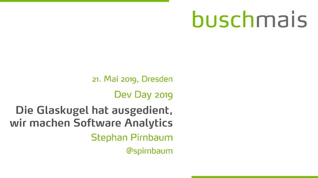 Schwerpunkte liegen in den Bereichen Softwareentwicklung, Architektur-beratung und Training. Gemeinsam mit unseren Kunden entwerfen und implementieren wir fachlich passgenaue Lösungen auf Basis der Java-Technologien. buschmais GbR Inhaber Torsten Busch, Frank Schwarz, Dirk Mahler und Tobias Israel Adresse Leipziger Str. 93 01127 Dresden [email protected] www.buschmais.de