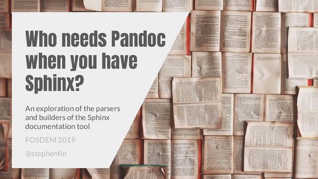 Using Sphinx doesn't necessarily mean using reStructuredText for input and HTML for output. We explore Sphinx's newfound support for Markdown as well as it's broad range output formats available, before moving onto an overview of how you can develop your parser and builder extensions.