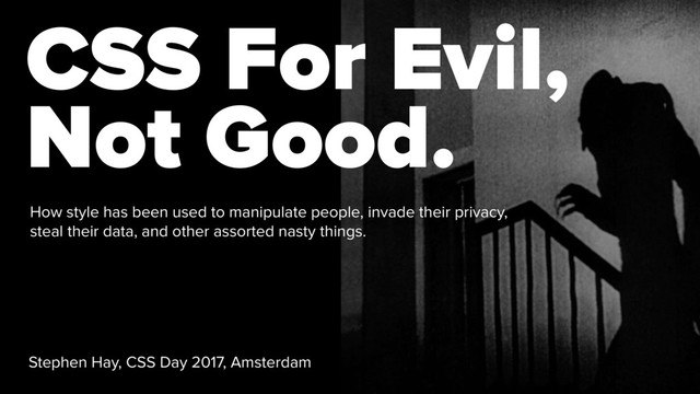 to manipulate people, invade their privacy, steal their data, and other assorted nasty things. Stephen Hay, CSS Day 2017, Amsterdam