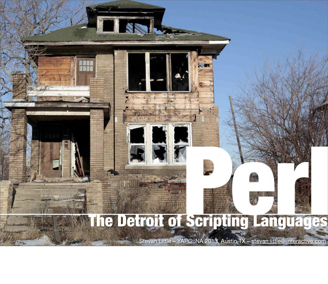 on with *this* talk. So first, why “Detroit”. Well, because Detroit *was* once the center of a lot of crazy productivity (like Perl), but many of Detroit’s biggest companies have since moved away (kinda like Perl), and Detroit has since begun to rot from the inside (a lot like Perl), because it is easy to make Detroit the but of jokes (also a lot like Perl). ... also lastly, because there are actually people out there that are working hard trying to fix up Detroit, but no one knows or cares (a really, really lot like Perl)!