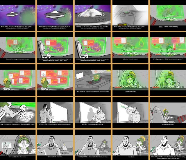 Exposition-heavy sequences like this one can often be challenging and not the most fun for story sketch artists to draw, but I usually try to wiggle in some light humor to break up the monotony of copious dialogue. In this one-on-one sequence between Bugs Bunny and a Looney Tune-ized LeBron James aboard Marvin's commandeered space ship, I pitched it with Bugs donning a Marvin the Martian-style Roman soldier helmet, based on the presumption that there would most likely be a spare one on the ship. It was a prop that I felt Bugs could play off of. I also shamelessly added the "Superman/Cleveland" dialogue exchange as a callback to another LeBron James movie, "Trainwreck", where in that film LeBron, again playing himself, was boasting to Bill Haidar's character about all the finer accomplishments of Cleveland, Ohio. I was pleasantly surprised both my jokes made it into the final film.