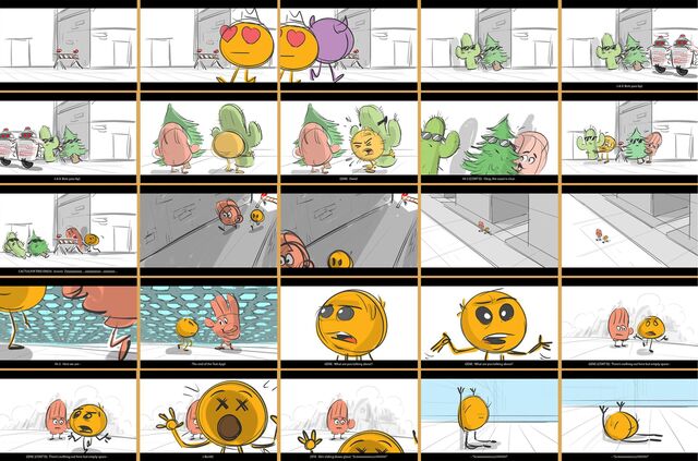 Following directly on the heels of the ‘Loser Lounge’ sequence, Gene and Hi-5 venture out to where no emoji has ever returned from: the phones's forbidden wallpaper. I added a few gags to this sequence that weren’t in the script that I had been trying to find just the right moment for. The first joke was Hi-5 feigning an attack by a monster just outside the messaging app's perimeter wall, only to reveal that it's actually a rubber toy on his finger. As a kid in the 80's, I used to get those colorful wiggly monster finger puppets from gumball machines all the time, and knew I wanted Hi-5 to sport one at some point in the film. The other joke was calling out the recently released "Angry Birds Movie" as a cash grab based on a popular smart phone trend. I felt the irony was apropos.