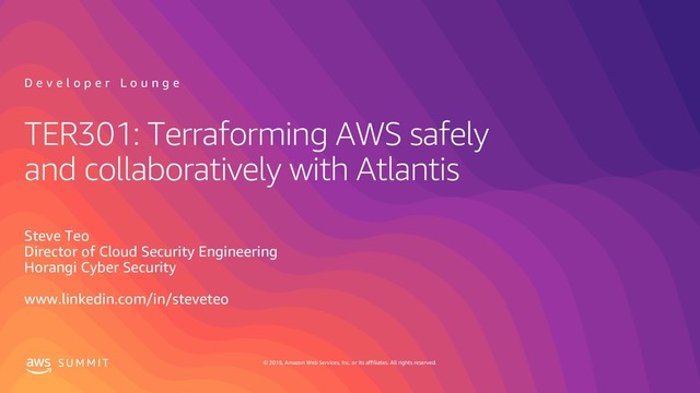 rights reserved. S U M M I T TER301: Terraforming AWS safely and collaboratively with Atlantis Steve Teo Director of Cloud Security Engineering Horangi Cyber Security www.linkedin.com/in/steveteo D e v e l o p e r L o u n g e