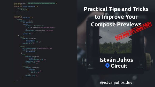 TitleSlide() } } @Composable private fun TitleSlide() { Column( modifier = Modifier .fillMaxSize() .paint( painter = painterResource( id = R.drawable.glenn_carstens_peters, ), contentScale = ContentScale.FillBounds, ) .padding(32.dp) ) { Title( modifier = Modifier .fillMaxWidth() .padding(top = 32.dp), fontSize = 70.sp, ) Column( horizontalAlignment = CenterHorizontally, modifier = Modifier .fillMaxWidth() ) { Name( modifier = Modifier .weight(1f) .padding(bottom = 66.dp), imageHeight = 66.dp, textSize = 70.sp, ) Contacts( modifier = Modifier .padding( bottom = 16.dp, end = 16.dp, ), fontSize = 50.sp, ) } } } Practical Tips and Tricks to Improve Your Compose Previews István Juhos @istvanjuhos.dev