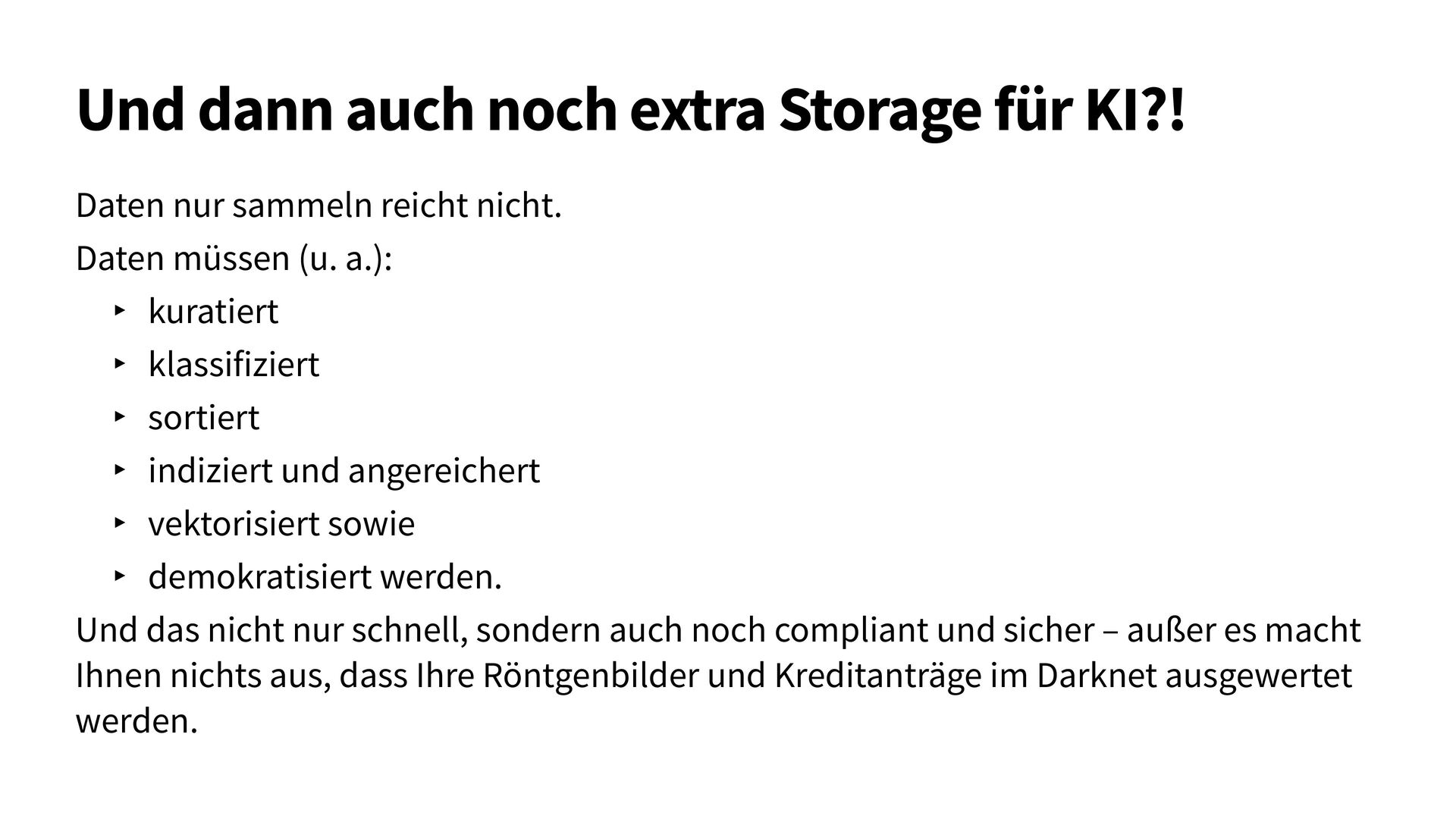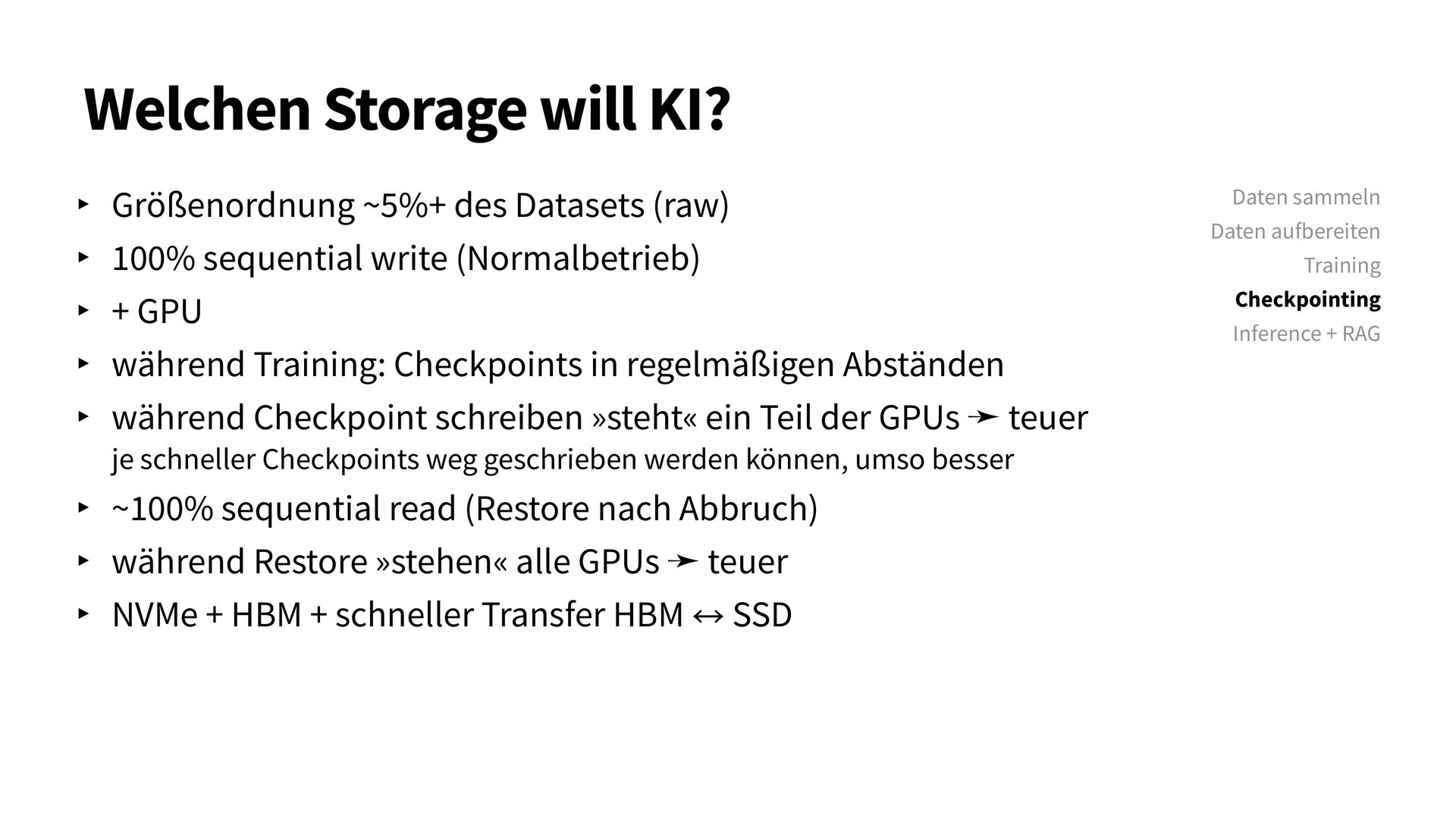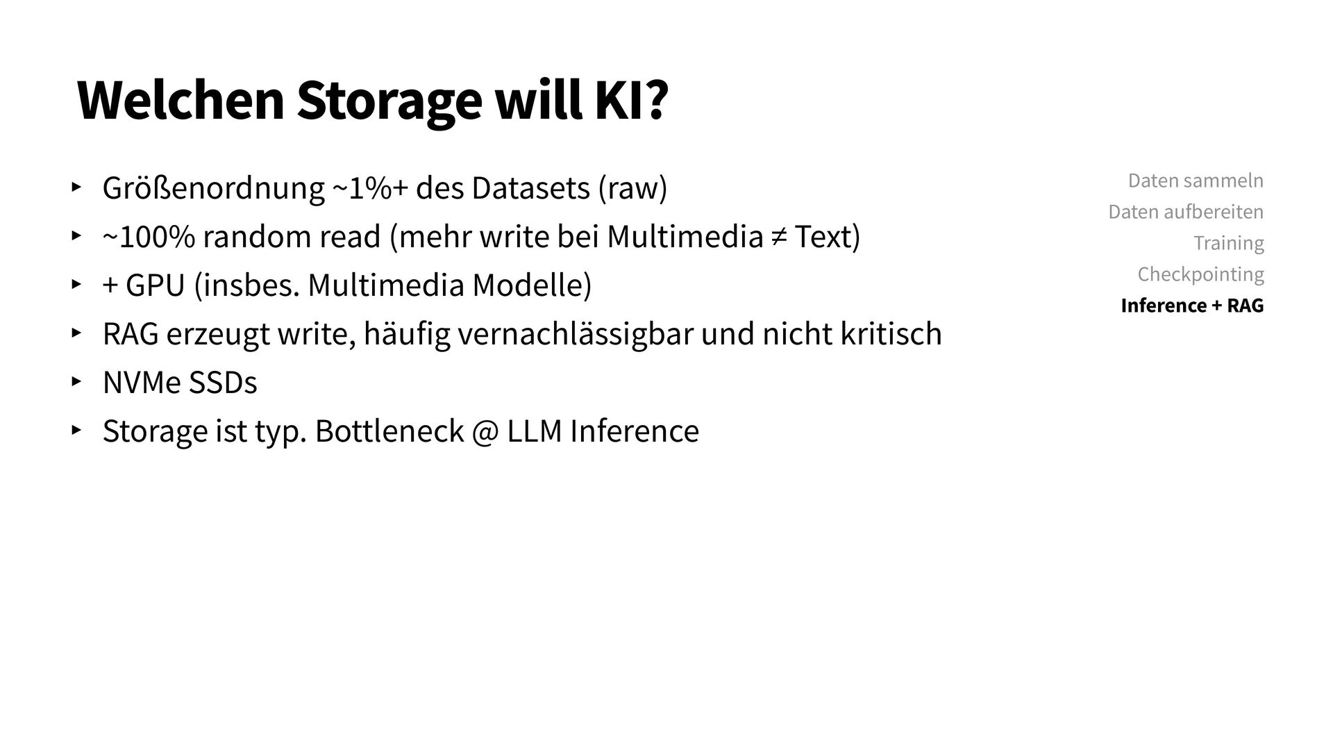 Im Vortrag beleuchten Wolfgang und Kerstin unter anderem spezifische Anforderungen in den Phasen Training und Inferenz, erklären, warum herkömmliche Storage-Lösungen scheitern (müssen), und zeigen sinnvolle Ansätze für den Betrieb einer optimalen Infrastruktur für KI-Workloads auf.