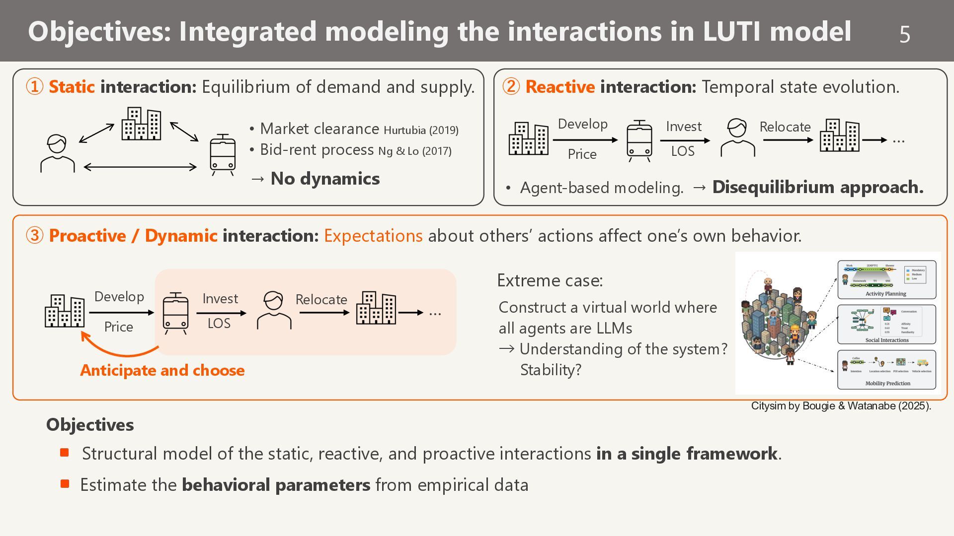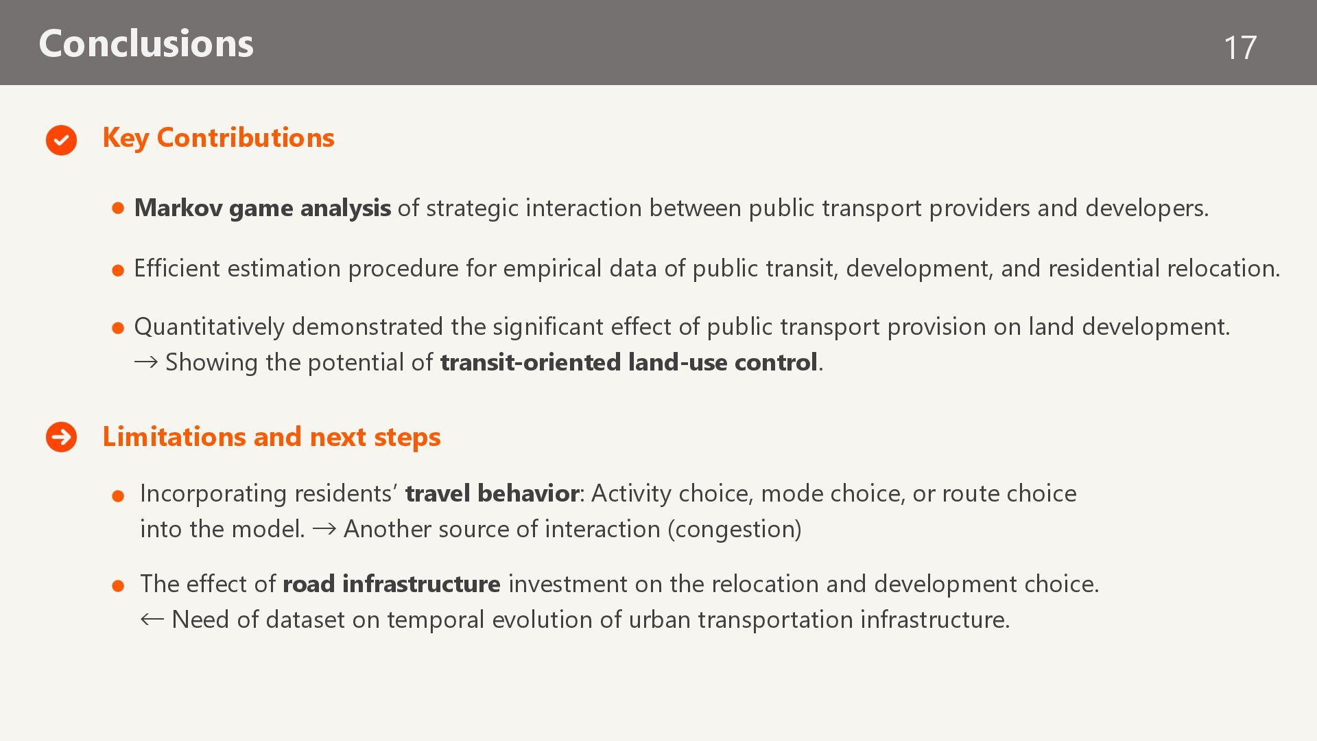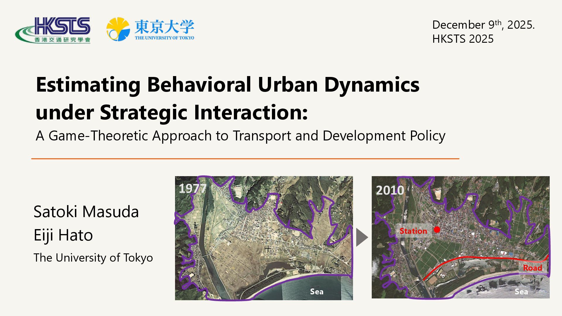 Slides for Masuda, S.* & Hato, E. (Dec 8-9, 2025). Estimating Behavioral Urban Dynamics under Strategic Interaction: A Game-Theoretic Approach to Transport and Development Policy, The 29th International Conference of Hong Kong Society for Transporation Studies (HKSTS), Hong Kong.