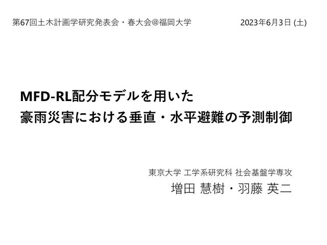 第67回土木計画学研究発表会・春大会での発表資料です。「MFD-RL配分モデルを用いた豪雨災害における垂直・水平避難の予測制御」