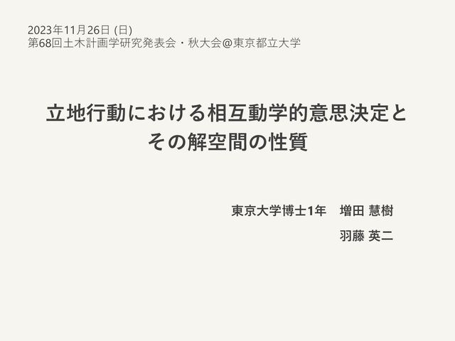 20年で60万⼈ ⾏政の居住誘導も 広域避難の体制必要.⽇本経済新聞. 2023- 08-24, ⽇経電⼦版, https://www.nikkei.com/article/DGXZQOUE221DL0S3A520C2000000/, 参照2023-11-19 • 朝倉康夫. 利⽤者均衡を制約とする交通ネットワーク の最適計画モデル. ⼟⽊計画学研究・論⽂集, 6:1–19, 1988. • Cai, Z., Mo, D., Tang, W., Chen, Y., & Chen, X. (. (2023). A two-period game-theoretical model for heterogeneous ride-sourcing platforms with asymmetric competition and mixed fleets. Transportation Research Part E: Logistics and Transportation Review, 178, 103279. https://doi.org/10.1016/j.tre.2023.103279 • Li, D., Islam, D. M. Z., Robinson, M., Song, D., Dong, J., & Reimann, M. (2023). Network revenue management game in the railway industry: Stackelberg equilibrium, global optimality, and mechanism design. European Journal of Operational Research, 312(1), 240-254. https://doi.org/10.1016/j.ejor.2023.06.044 • Zheng, Y., Lin, Y., Zhao, L., Wu, T., Jin, D., & Li, Y. (2023). Spatial planning of urban communities via deep reinforcement learning. Nature Computational Science, 1-15. • Qian, K., Mao, L., Liang, X., Ding, Y., Gao, J., Wei, X., ... & Li, J. (2023). AI Agent as Urban Planner: Steering Stakeholder Dynamics in Urban Planning via Consensus-based Multi-Agent Reinforcement Learning. arXiv preprint arXiv:2310.16772. • Zheng, S., Trott, A., Srinivasa, S., Parkes, D. C., & Socher, R. (2022). The AI Economist: Taxation policy design via two-level deep multiagent reinforcement learning. Science Advances. https://doi.org/abk2607 • Silver, D., Hubert, T., Schrittwieser, J., Antonoglou, I., Lai, M., Guez, A., Lanctot, M., Sifre, L., Kumaran, D., Graepel, T., Lillicrap, T., Simonyan, K., & Hassabis, D. (2018). A general reinforcement learning algorithm that masters chess, shogi, and Go through self-play. Science. https://doi.org/aar6404 16 参考⽂献