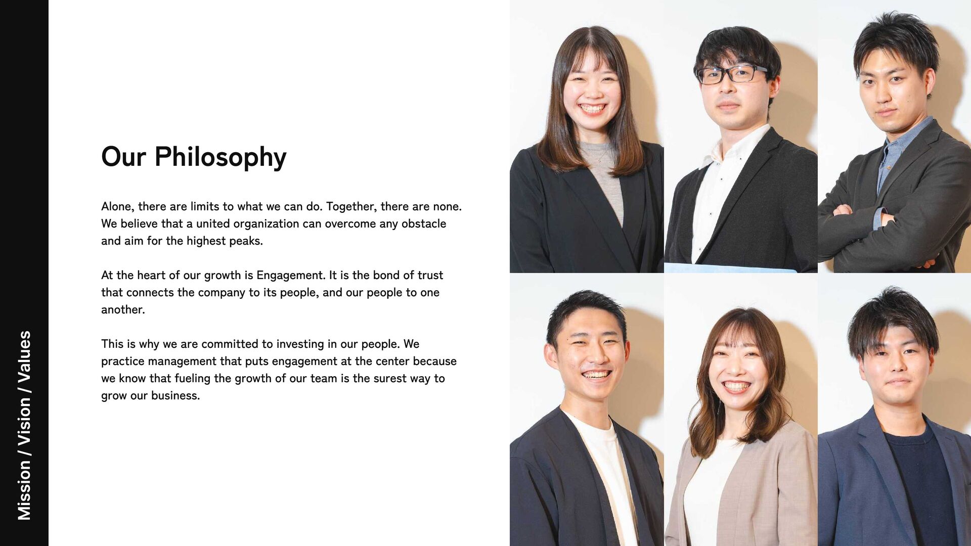 limits to what we can do. Together, there are none. We believe that a united organization can overcome any obstacle and aim for the highest peaks. At the heart of our growth is Engagement. It is the bond of trust that connects the company to its people, and our people to one another. This is why we are committed to investing in our people. We practice management that puts engagement at the center because we know that fueling the growth of our team is the surest way to grow our business.