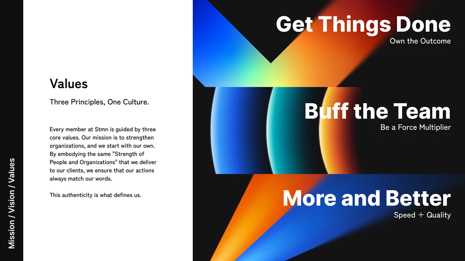 Team More and Better Three Principles, One Culture. Every member at Stmn is guided by three core values. Our mission is to strengthen organizations, and we start with our own. By embodying the same "Strength of People and Organizations" that we deliver to our clients, we ensure that our actions always match our words. This authenticity is what defines us. Values Speed + Quality Be a Force Multiplier Own the Outcome