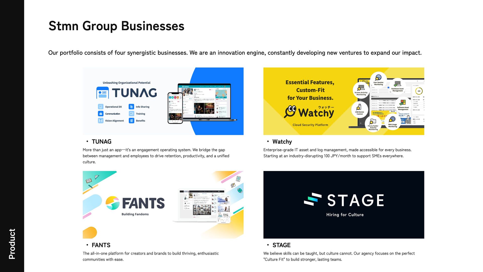 We are an innovation engine, constantly developing new ventures to expand our impact. Product Unleashing Organizational Potential Operational DX Info Sharing Communication Training Vision Alignment Benefits TUNAG More than just an app—it’s an engagement operating system. We bridge the gap between management and employees to drive retention, productivity, and a unified culture. Essential Features, Custom-Fit for Your Business. Cloud Security Platform 設定 お知らせ 2022/6/24 12:54 新しいモジュールが追されました! 2022/6/24 12:54 【復旧】プッシュ通知が一部届かない件について 2022/6/24 12:54 【 完了】シ ステムメンテナンスを実施しました 最新 のアラー ト 2022/6/24 12:54 キー ワー ド「請求書」を含むファイル を追 加しました 菊池 義勝 2022/6/24 12:54 キー ワー ド「請求書」を含むファイル を追 加しました 松下 三男 2022/6/24 12:54 外部 端末「USB」へファイル 「ホゲホゲ」を削しました 湯浅 れい や 2022/6/24 12:54 外部 端末「USB」へファイル 「ホゲホゲ」を削しました 湯浅 れい や 2022/6/24 12:54 外部 端末「USB」へファイル 「ホゲホゲ」を削しました 湯浅 れい や ライセンス利用状況 280 保有ライセンス数 280 利用ライセンス数 274 ファイル 監視 78 外部 端末監視 78 スクリー ン監視 78 ゴミ箱監視 40 空きライセンス数 6 チェッ カー 稼働状況 稼働チェッ カー 数 84 接続中 80 未接続 4 Screen Acti vit y Monitoring Har dware Asset Management USB De vice Control Soft ware Asset Management File & Fol der Acti vit y Monitoring We b Usage Monitoring User Session Monitoring Wa t chy Enterprise -grade IT asset and log management, made accessible for every business. Starting at an industry -disrupting 100 JPY/month to support SM Es everywhere. Building Fandoms 9:41 F ANTS The all -in -one platform for creators and brands to build thriving, enthusiastic communities with ease. Hirin g for Cu lture STAG E We believe s kills can be taught, but culture cannot. Our agency focuses on the perfect "Culture Fit " to build stronger, lasting teams.