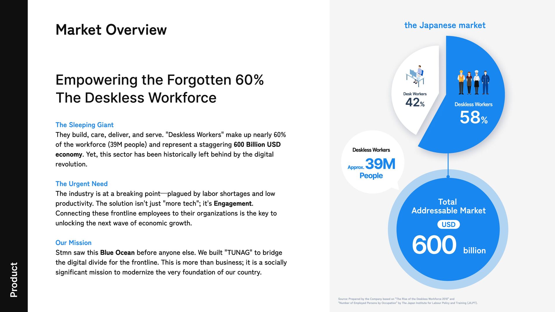 The Urgent Need Our Mission They build, care, deliver, and serve. "Deskless Workers" make up nearly 60% of the workforce (39M people) and represent a staggering 600 Billion USD economy. Yet, this sector has been historically left behind by the digital revolution. The industry is at a breaking point—plagued by labor shortages and low productivity. The solution isn't just "more tech"; it's Engagement. Connecting these frontline employees to their organizations is the key to unlocking the next wave of economic growth. Stmn saw this Blue Ocean before anyone else. We built "TUNAG" to bridge the digital divide for the frontline. This is more than business; it is a socially significant mission to modernize the very foundation of our country.