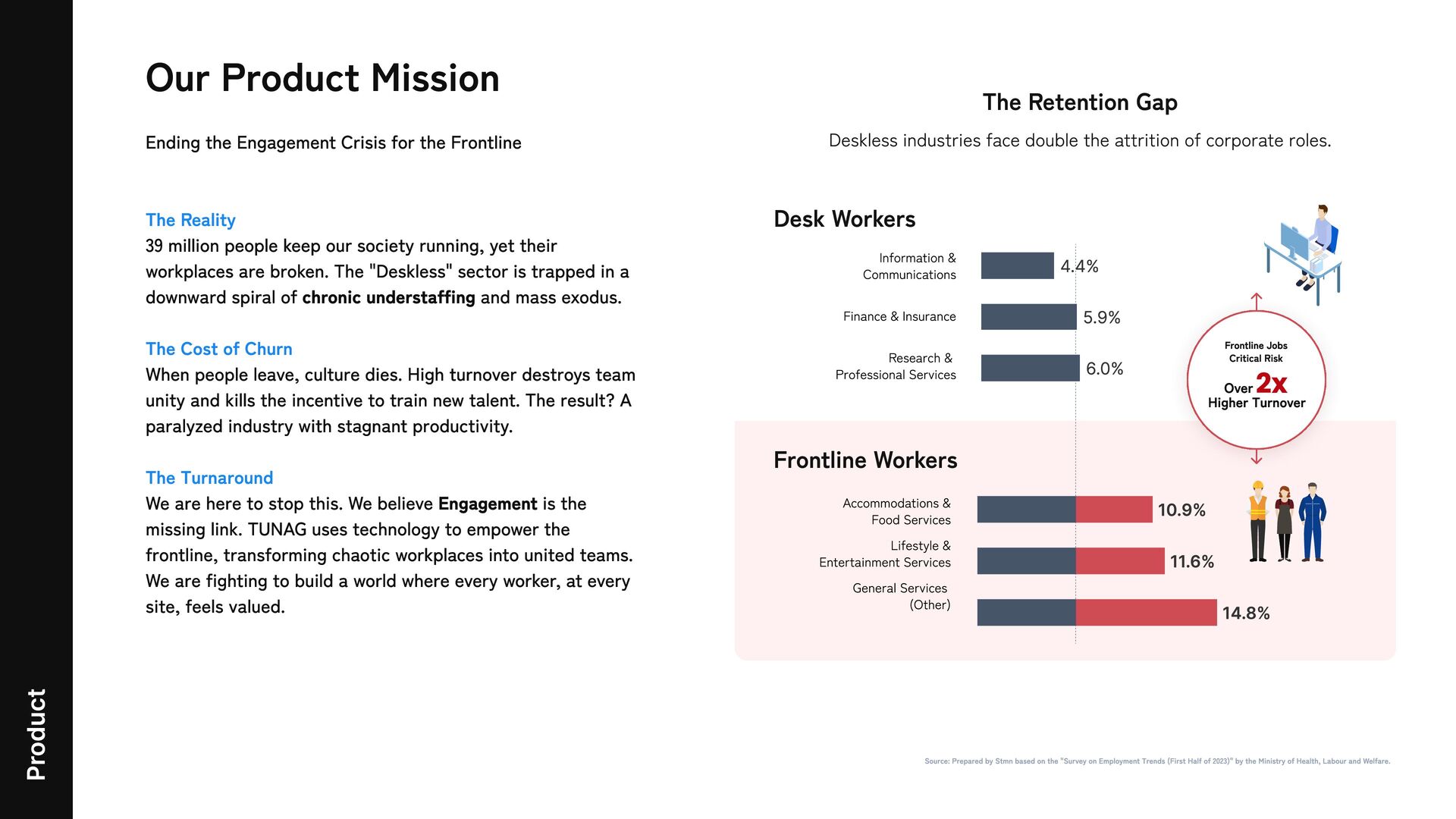 the "Survey on Employment Trends (First Half of 2023)" by the Ministry of Health, Labour and Welfare. The Reality The Cost of Churn The Turnaround 39 million people keep our society running, yet their workplaces are broken. The "Deskless" sector is trapped in a downward spiral of chronic understaffing and mass exodus. When people leave, culture dies. High turnover destroys team unity and kills the incentive to train new talent. The result? A paralyzed industry with stagnant productivity. We are here to stop this. We believe Engagement is the missing link. TUNAG uses technology to empower the frontline, transforming chaotic workplaces into united teams. We are fighting to build a world where every worker, at every site, feels valued. The Retention Gap Deskless industries face double the attrition of corporate roles. Frontline Jobs Critical Risk Over Higher Turnover 2x Accommodations & Food Services Lifestyle & Entertainment Services General Services (Ot her ) 10.9%​ 11.6%​ 14.8%​ Information & Comm unications Finance & Ins urance Researc h & Professional Services 4.4%​ 5.9%​ 6.0%​ Desk Workers Frontline Workers Ending the Engagement Crisis for the Frontline