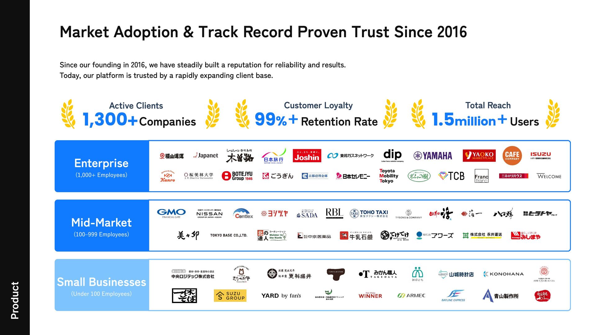our founding in 2016, we have steadily built a reputation for reliability and results. Today, our platform is trusted by a rapidly expanding client base. Product Enterprise (1,000+ Employees) Mid-Market (100–999 Employees) Small Businesses (Under 100 Employees) 1,300+ Companies Active Clients 99%+ Retention Rate Customer Loyalty 1.5million+ Users Total Reach