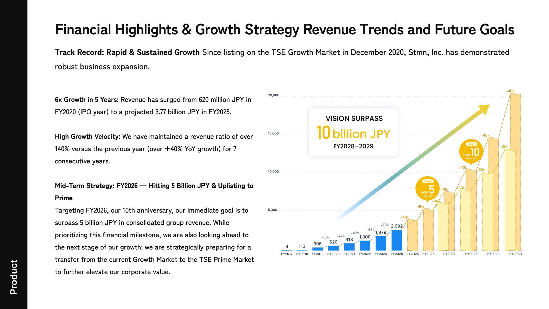 Product 20,000 15,000 10,000 5,000 6​ FY2017 113​ FY2018 396​ FY2019 620​ FY2020 913​ FY2021 1,300​ FY2022 1,879​ FY2023 2,692 FY2024 FY2025 FY2026 FY2027 FY2028 FY2029 FY2030 +30% +56% +47% +42% +44% +43% +40% +40% +30% +30% +30% +40% +40% +40% +40% SURPASS VISION FY2028–2029 1 0 billion JPY 6x Growth in 5 Years: Revenue has surged from 620 million JPY in FY2020 (IPO year) to a projected 3.77 billion JPY in FY2025. High Growth Velocity: We have maintained a revenue ratio of over 140% versus the previous year (over +40% YoY growth) for 7 consecutive years. Mid-Term Strategy: FY2026 — Hitting 5 Billion JPY & Uplisting to Prime Targeting FY2026, our 10th anniversary, our immediate goal is to surpass 5 billion JPY in consolidated group revenue. While prioritizing this financial milestone, we are also looking ahead to the next stage of our growth: we are strategically preparing for a transfer from the current Growth Market to the TSE Prime Market to further elevate our corporate value. Track Record: Rapid & Sustained Growth Since listing on the TSE Growth Market in December 2020, Stmn, Inc. has demonstrated robust business expansion. over 5 Targrt billion JPY over 10 Targrt billion JPY