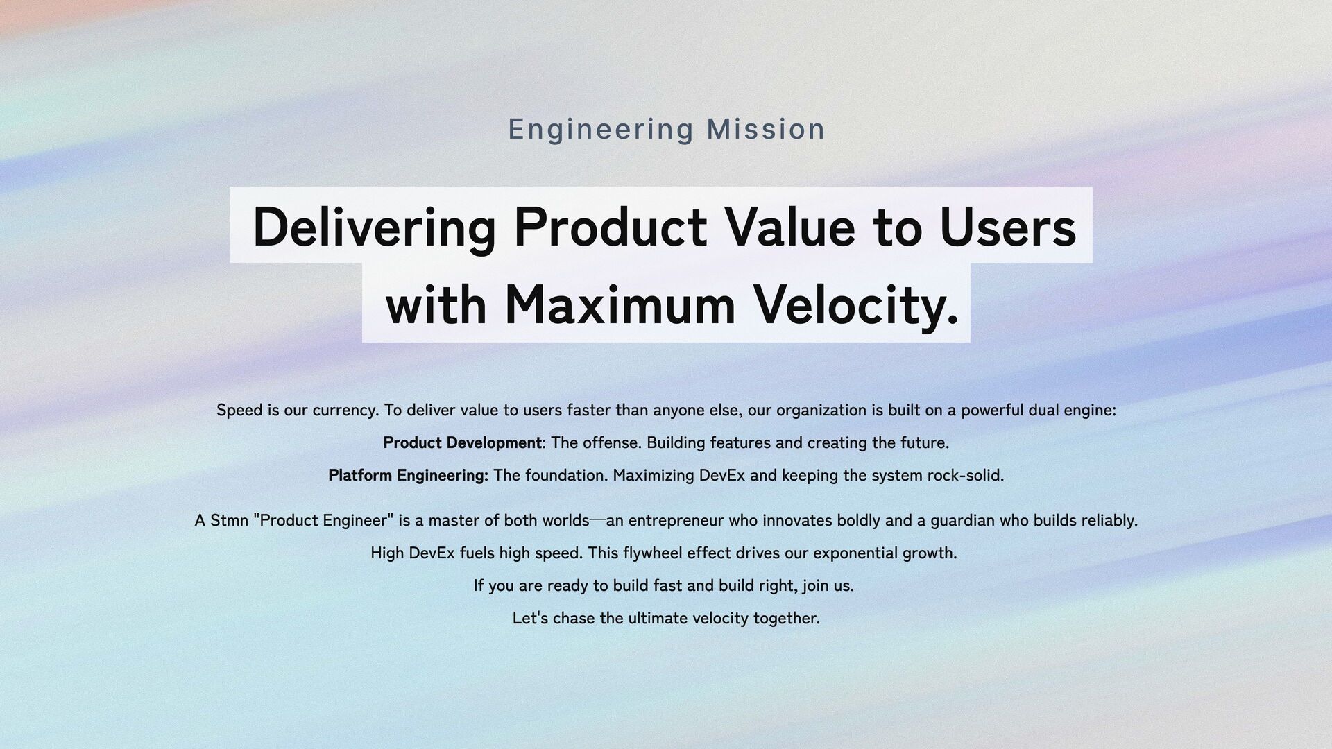 than anyone else, our organization is built on a powerful dual engine: Product Development: The offense. Building features and creating the future. Platform Engineering: The foundation. Maximizing DevEx and keeping the system rock-solid. A Stmn "Product Engineer" is a master of both worlds—an entrepreneur who innovates boldly and a guardian who builds reliably. High DevEx fuels high speed. This flywheel effect drives our exponential growth. If you are ready to build fast and build right, join us. Let's chase the ultimate velocity together. Engineering Mission Delivering Product Value to Users with Maximum Velocity.
