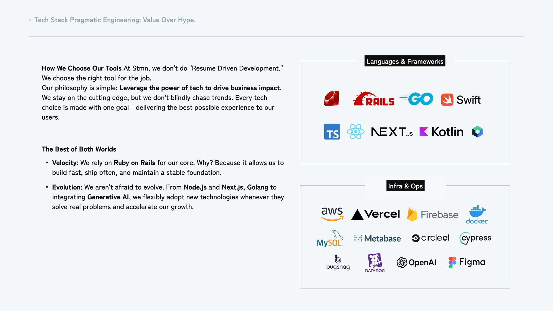 Infra & Ops How We Choose Our Tools At Stmn, we don't do "Resume Driven Development." We choose the right tool for the job. Our philosophy is simple: Leverage the power of tech to drive business impact. We stay on the cutting edge, but we don't blindly chase trends. Every tech choice is made with one goal—delivering the best possible experience to our users. Velocity: We rely on Ruby on Rails for our core. Why? Because it allows us to build fast, ship often, and maintain a stable foundation. Evolution: We aren't afraid to evolve. From Node.js and Next.js, Golang to integrating Generative AI, we flexibly adopt new technologies whenever they solve real problems and accelerate our growth. The Best of Both Worlds