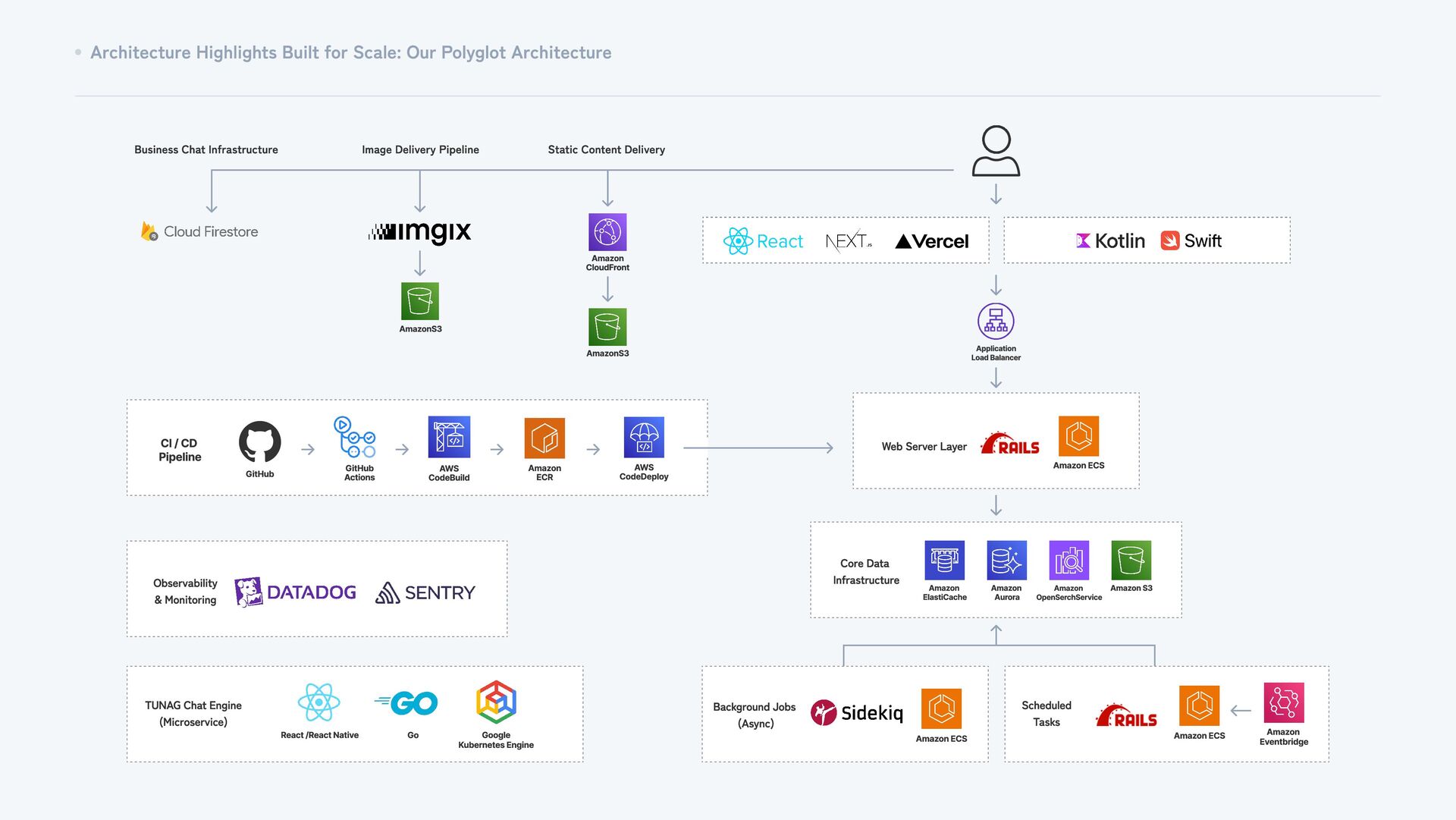 Infrastructure Image Delivery Pipeline AmazonS3 AmazonS3 Amazon CloudFront Application Load Balancer Amazon ECS Web Server Layer Amazon ECS Scheduled Tasks Amazon Eventbridge Amazon ECS Observability & Monitoring React /React Native Go Google Kubernetes Engine TUNAG Chat Engine (Microservice) CI / CD Pipeline GitHub GitHub Actions AWS CodeBuild Amazon ECR AWS CodeDeploy Amazon ElastiCach e Amazon Aurora Amazon O penSerch Service Amazon S3 Core Data Infrastructure Background J obs (Async) Static Content Delivery