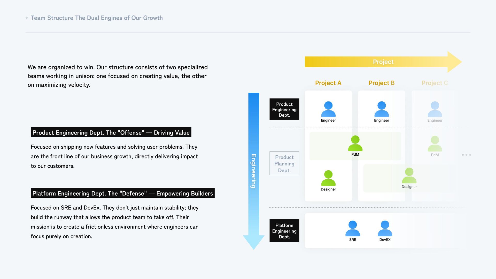 organized to win. Our structure consists of two specialized teams working in unison: one focused on creating value, the other on maximizing velocity. Product Engineering Dept. The "Offense" — Driving Value Focused on shipping new features and solving user problems. They are the front line of our business growth, directly delivering impact to our customers. Platform Engineering Dept. The "Defense" — Empowering Builders Focused on SRE and DevEx. They don't just maintain stability; they build the runway that allows the product team to take off. Their mission is to create a frictionless environment where engineers can focus purely on creation. Project A Engineer Designer Project B Engineer Project C Engineer PdM PdM Designer DevEX SRE Engineering Project Product Engineering Dept. Platform Engineering Dept. Product Planning Dept.