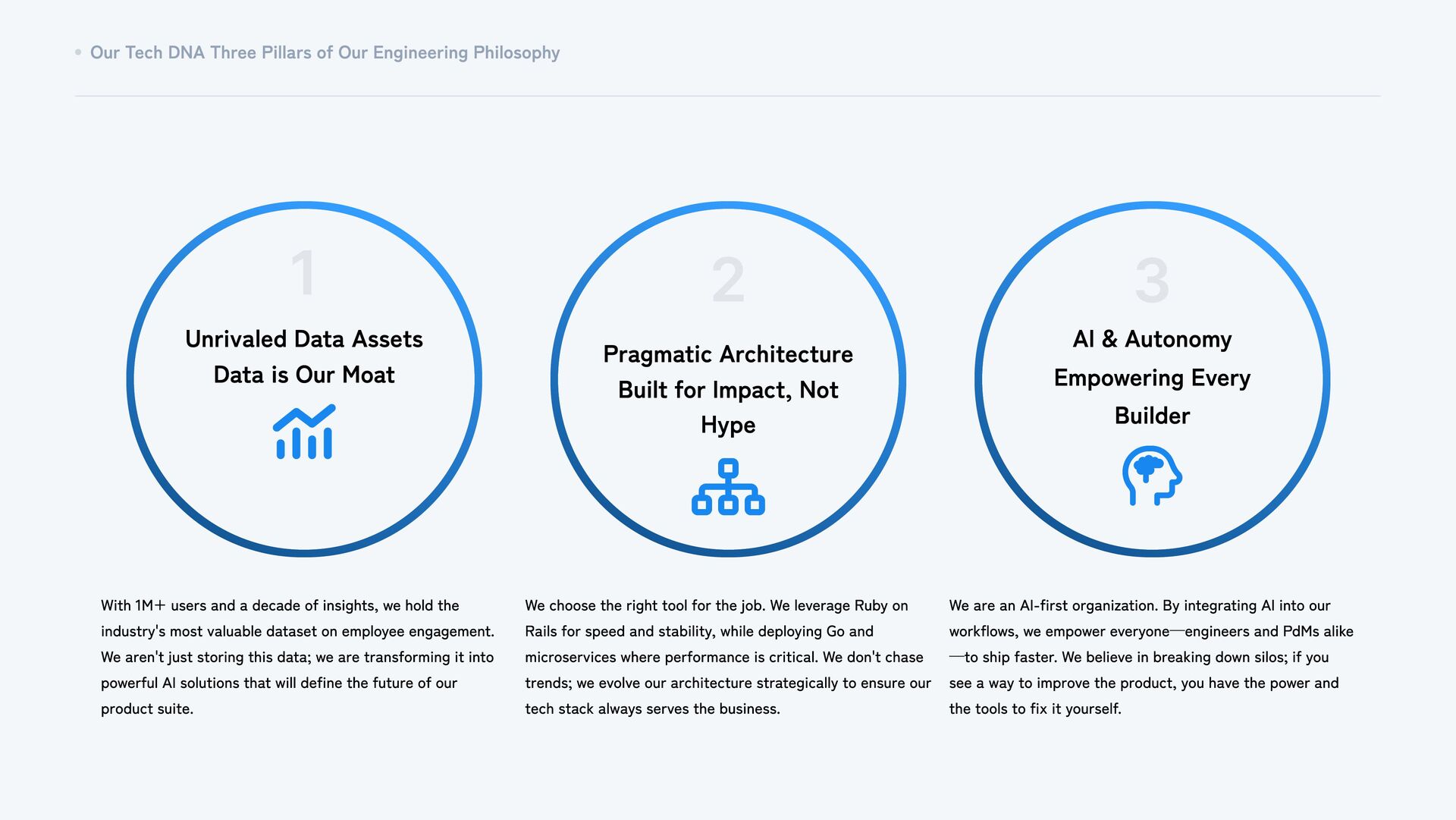 Unrivaled Data Assets Data is Our Moat With 1M+ users and a decade of insights, we hold the industry's most valuable dataset on employee engagement. We aren't just storing this data; we are transforming it into powerful AI solutions that will define the future of our product suite. 2 Pragmatic Architecture Built for Impact, Not Hype We choose the right tool for the job. We leverage Ruby on Rails for speed and stability, while deploying Go and microservices where performance is critical. We don't chase trends; we evolve our architecture strategically to ensure our tech stack always serves the business. 3 AI & Autonomy Empowering Every Builder We are an AI-first organization. By integrating AI into our workflows, we empower everyone—engineers and PdMs alike —to ship faster. We believe in breaking down silos; if you see a way to improve the product, you have the power and the tools to fix it yourself.
