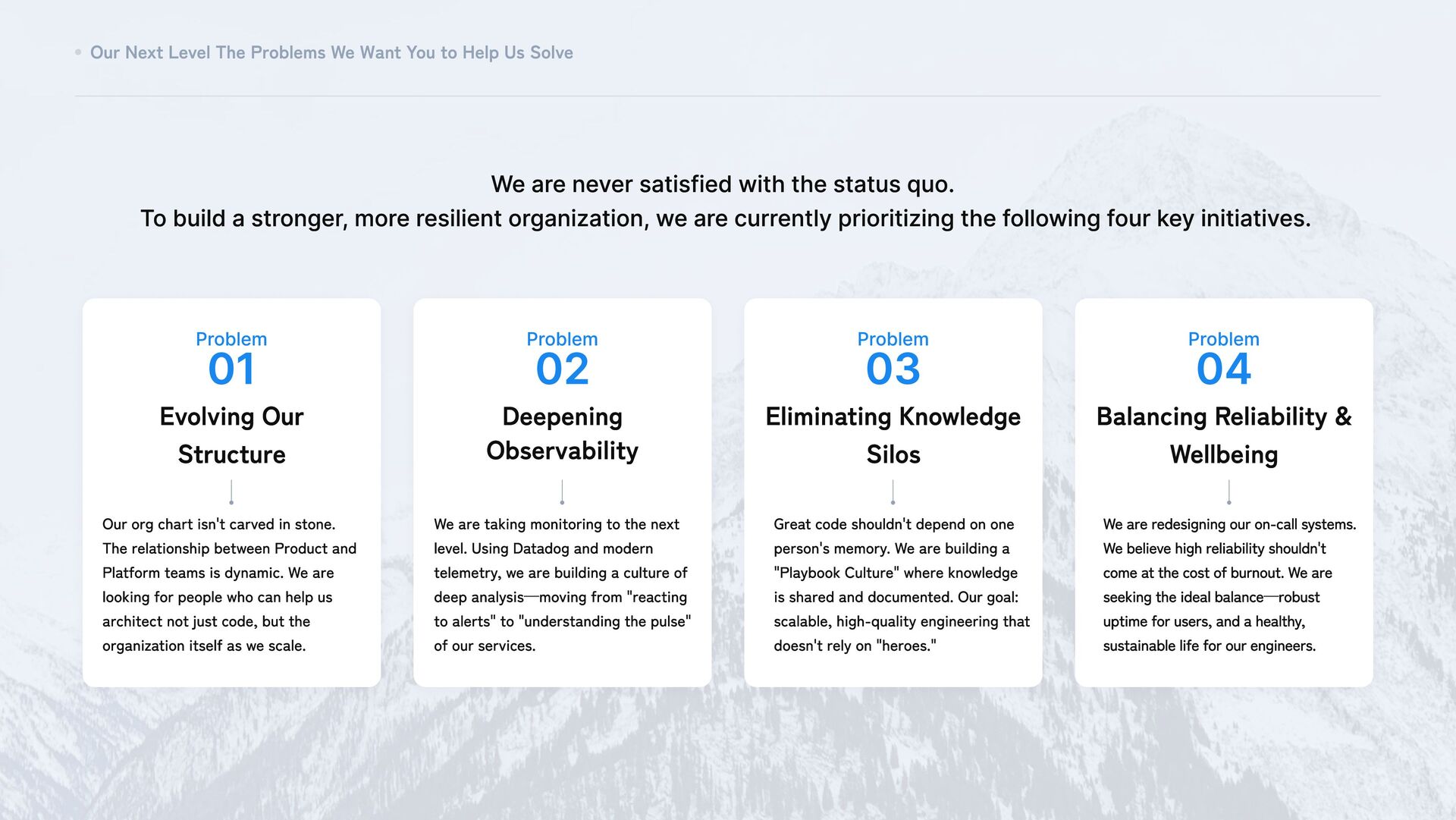 03 Eliminating Knowledge Silos Problem 04 Balancing Reliability & Wellbeing We are never satisfied with the status quo. To build a stronger, more resilient organization, we are currently prioritizing the following four key initiatives. Our Next Level The Problems We Want You to Help Us Solve Our org chart isn't carved in stone. The relationship between Product and Platform teams is dynamic. We are looking for people who can help us architect not just code, but the organization itself as we scale. We are redesigning our on-call systems. We believe high reliability shouldn't come at the cost of burnout. We are seeking the ideal balance—robust uptime for users, and a healthy, sustainable life for our engineers. Great code shouldn't depend on one person's memory. We are building a "Playbook Culture" where knowledge is shared and documented. Our goal: scalable, high-quality engineering that doesn't rely on "heroes." We are taking monitoring to the next level. Using Datadog and modern telemetry, we are building a culture of deep analysis—moving from "reacting to alerts" to "understanding the pulse" of our services.
