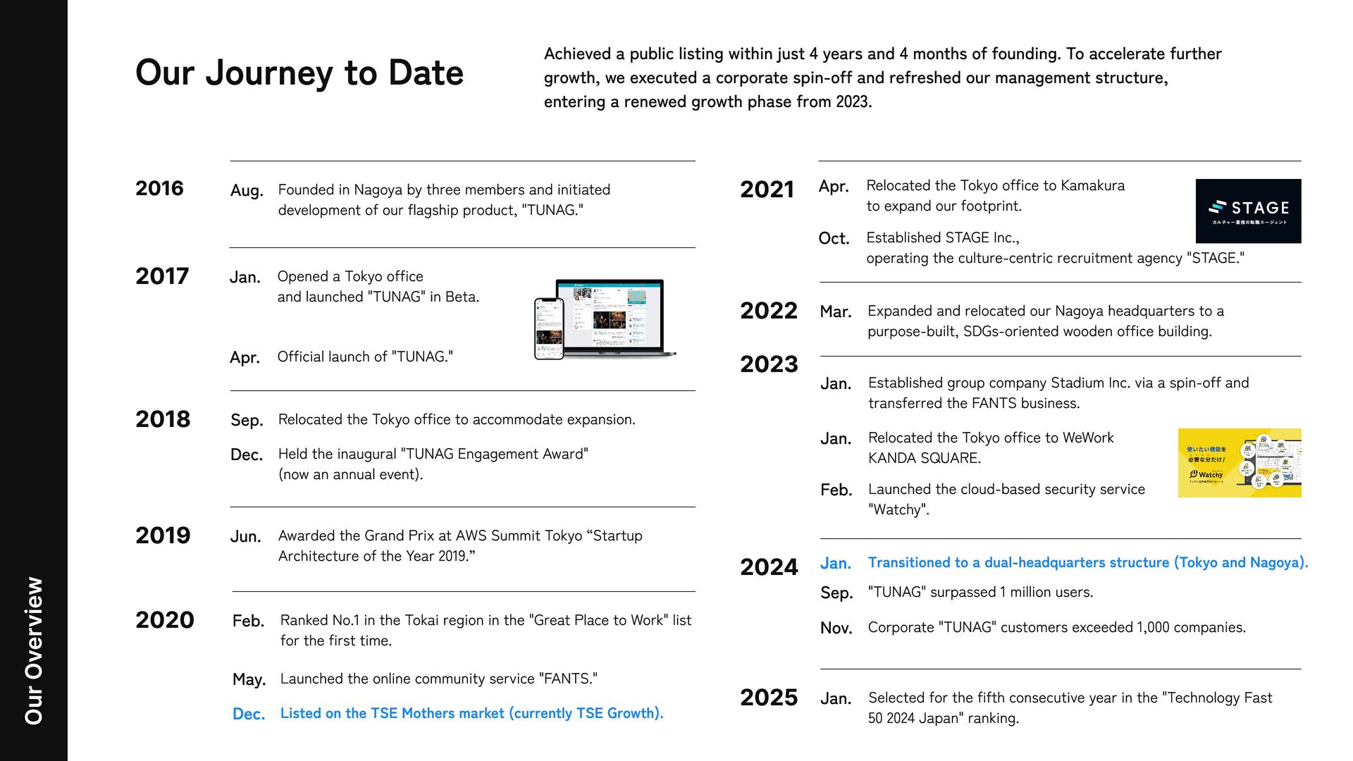 Nagoya by three members and initiated development of our flagship product, "TUNAG." 2017 Jan. Opened a Tokyo office and launched "TUNAG" in Beta. Apr. Official launch of "TUNAG." 2018 Sep. Relocated the Tokyo office to accommodate expansion. Dec. Held the inaugural "TUNAG Engagement Award" (now an annual event). 2019 Jun. Awarded the Grand Prix at AWS Summit Tokyo “Startup Architecture of the Year 2019.” 2020 Feb. Ranked No.1 in the Tokai region in the "Great Place to Work" list for the first time. May. Launched the online community service "FANTS." Dec. Listed on the TSE Mothers market (currently TSE Growth). 2021 Apr. Relocated the Tokyo office to Kamakura to expand our footprint. Oct. Established STAGE Inc., operating the culture-centric recruitment agency "STAGE." カル チャー 重視 の 転 職 エー ジェント 2022 Mar. Expanded and relocated our Nagoya headquarters to a purpose-built, SDGs-oriented wooden office building. 2023 Jan. Established group company Stadium Inc. via a spin-off and transferred the FANTS business. Jan. Relocated the Tokyo office to WeWork KANDA SQUARE. Feb. Launched the cloud-based security service "Watchy". 2024 Jan. Transitioned to a dual-headquarters structure (Tokyo and Nagoya). Sep. "TUNAG" surpassed 1 million users. Nov. C orporate "TUNAG" customers exceeded 1,000 companies. 2025 Jan. Selected for the fifth consecutive year in the "Technology Fast 5 0 2024 J apan" ranking. Achi eved a publi c listi ng withi n j ust 4 years and 4 months of foundi ng. To accel erate f urth er growth, w e ex ecuted a corporate s pi n-off and ref resh ed our m anagem ent structure, enteri ng a renew ed growth ph as e f rom 2023 .