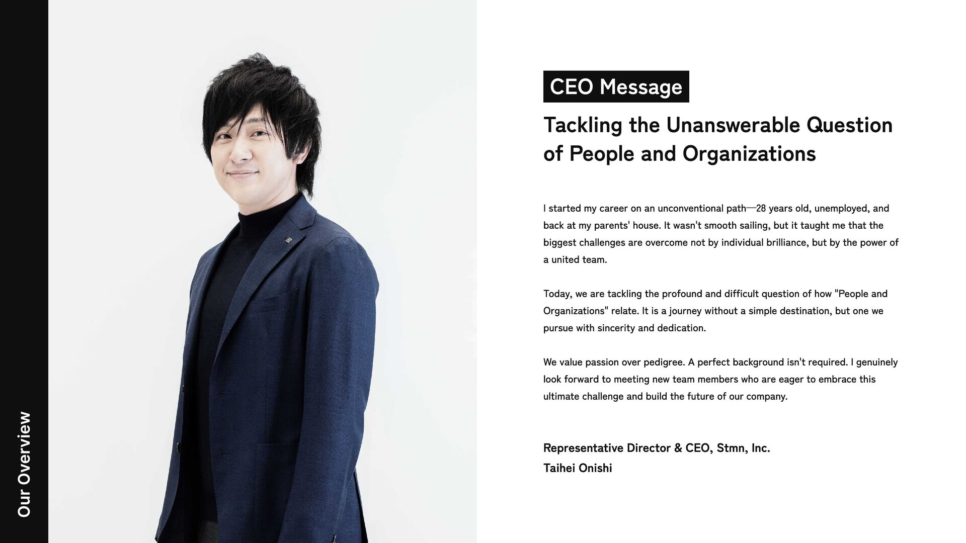 Organizations I started my career on an unconventional path—28 years old, unemployed, and back at my parents' house. It wasn't smooth sailing, but it taught me that the biggest challenges are overcome not by individual brilliance, but by the power of a united team. Today, we are tackling the profound and difficult question of how "People and Organizations" relate. It is a journey without a simple destination, but one we pursue with sincerity and dedication. We value passion over pedigree. A perfect background isn't required. I genuinely look forward to meeting new team members who are eager to embrace this ultimate challenge and build the future of our company. Representative Director & CEO, Stmn, Inc. Taihei Onishi Our Overview