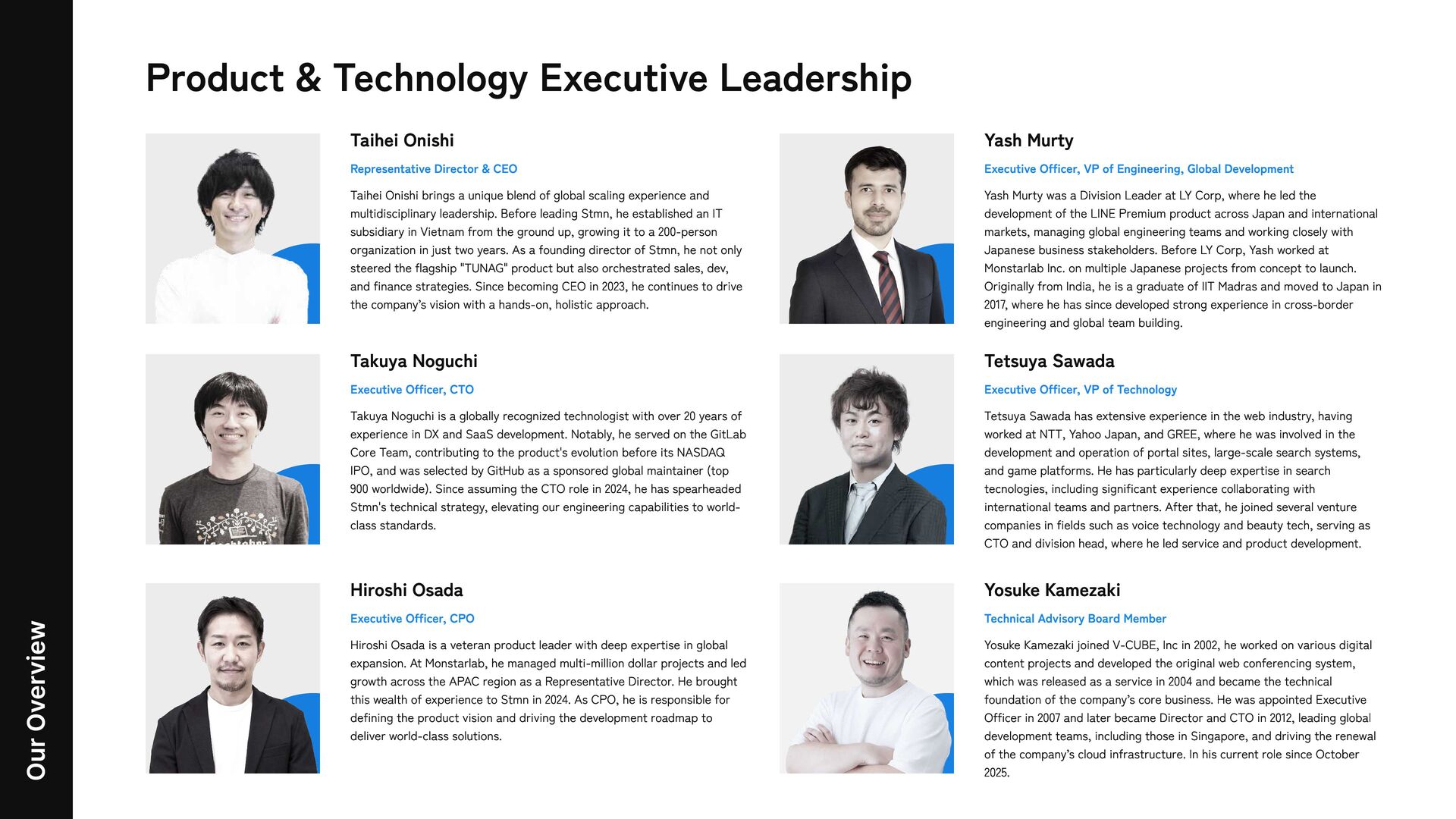 Director & CEO Taihei Onishi brings a unique blend of global scaling experience and multidisciplinary leadership. Before leading Stmn, he established an IT subsidiary in Vietnam from the ground up, growing it to a 200-person organization in just two years. As a founding director of Stmn, he not only steered the flagship "TUNAG" product but also orchestrated sales, dev, and finance strategies. Since becoming CEO in 2023, he continues to drive the company’s vision with a hands-on, holistic approach. Yash Murty Executive Officer, VP of Engineering, Global Development Yash Murty was a Division Leader at LY Corp, where he led the development of the LINE Premium product across Japan and international markets, managing global engineering teams and working closely with Japanese business stakeholders. Before LY Corp, Yash worked at Monstarlab Inc. on multiple Japanese projects from concept to launch. Originally from India, he is a graduate of IIT Madras and moved to Japan in 2017, where he has since developed strong experience in cross-border engineering and global team building. Tetsuya Sawada Executive Officer, VP of Technology Tetsuya Sawada has extensive experience in the web industry, having worked at NTT, Yahoo Japan, and GREE, where he was involved in the development and operation of portal sites, large-scale search systems, and game platforms. He has particularly deep expertise in search tecnologies, including significant experience collaborating with international teams and partners. After that, he joined several venture companies in fields such as voice technology and beauty tech, serving as CTO and division head, where he led service and product development. Takuya Noguchi Executive Officer, CTO Takuya Noguchi is a globally recognized technologist with over 20 years of experience in DX and SaaS development. Notably, he served on the GitLab Core Team, contributing to the product's evolution before its NASDAQ IPO, and was selected by GitHub as a sponsored global maintainer (top 900 worldwide). Since assuming the CTO role in 2024, he has spearheaded Stmn's technical strategy, elevating our engineering capabilities to world- class standards. Hiroshi Osada Executive Officer, CPO Hiroshi Osada is a veteran product leader with deep expertise in global expansion. At Monstarlab, he managed multi-million dollar projects and led growth across the APAC region as a Representative Director. He brought this wealth of experience to Stmn in 2024. As CPO, he is responsible for defining the product vision and driving the development roadmap to deliver world-class solutions. Yosuke Kamezaki Technical Advisory Board Member Yosuke Kamezaki joined V-CUBE, Inc in 2002, he worked on various digital content projects and developed the original web conferencing system, which was released as a service in 2004 and became the technical foundation of the company’s core business. He was appointed Executive Officer in 2007 and later became Director and CTO in 2012, leading global development teams, including those in Singapore, and driving the renewal of the company’s cloud infrastructure. In his current role since October 2025.