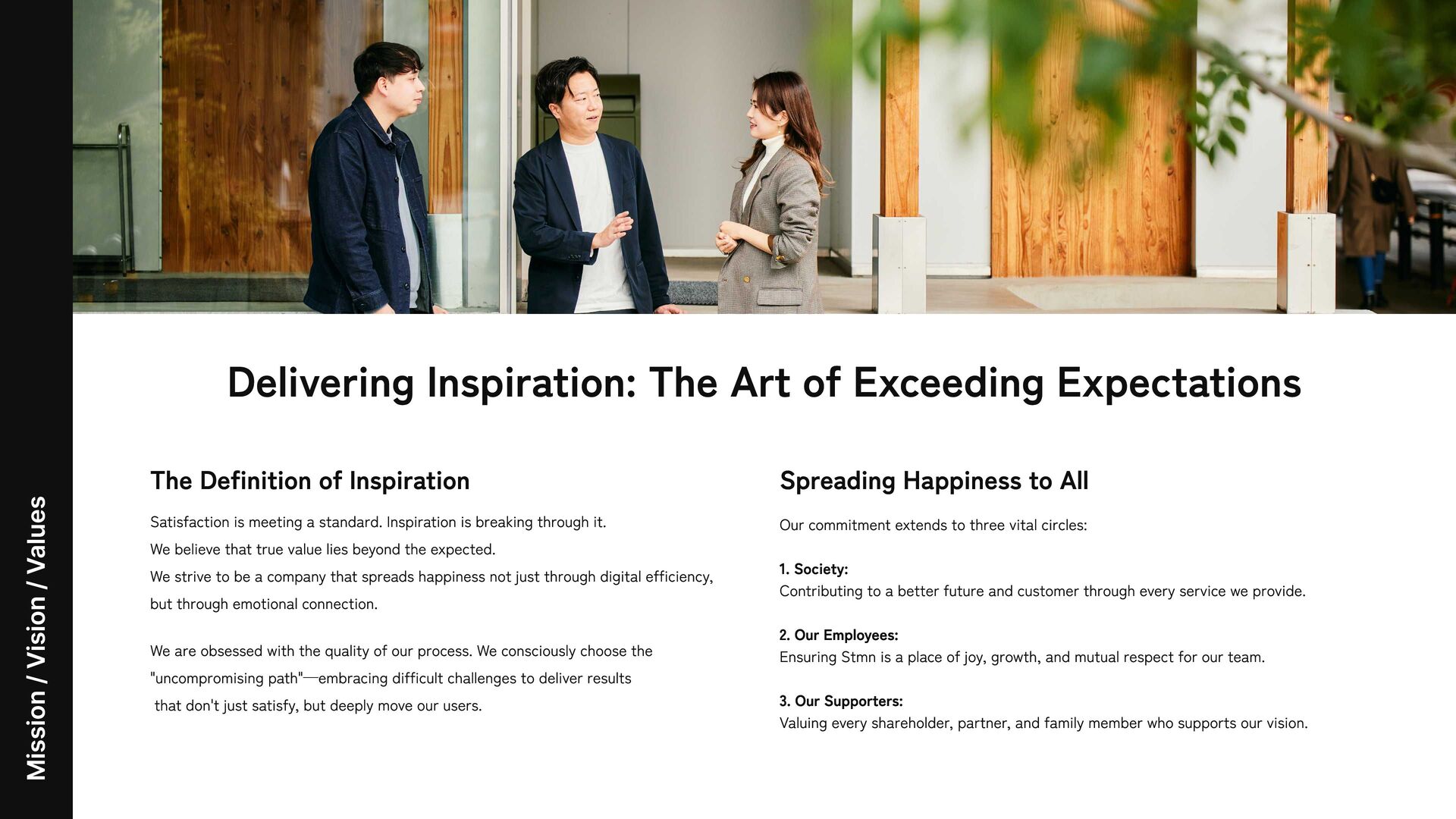 Exceeding Expectations The Definition of Inspiration Spreading Happiness to All Our commitment extends to three vital circles: 1. Society: Contributing to a better future and customer through every service we provide. 2. Our Employees: Ensuring Stmn is a place of joy, growth, and mutual respect for our team. 3. Our Supporters: Valuing every shareholder, partner, and family member who supports our vision. Satisfaction is meeting a standard. Inspiration is breaking through it. We believe that true value lies beyond the expected. We strive to be a company that spreads happiness not just through digital efficiency, but through emotional connection. We are obsessed with the quality of our process. We consciously choose the "uncompromising path"—embracing difficult challenges to deliver results that don't just satisfy, but deeply move our users.