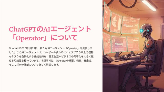 ChatGPTのAIエージェント 「Operator」について OpenAIは2025年1⽉23⽇、新たなAIエージェント「Operator」を発表しま した。このAIエージェントは、ユーザーの代わりにウェブブラウザ上で複雑 なタスクを⾃動化する機能を持ち、⽇常⽣活やビジネスの効率化を⼤きく進 める可能性を秘めています。本記事では、Operatorの概要、機能、安全性、 そして将来の展望について詳しく解説します。