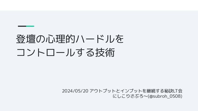 登壇の心理的ハードルを コントロールする技術 2024/05/20 アウトプットとインプットを継続する秘訣LT会 にしこりさぶろ〜(@subroh_0508)
