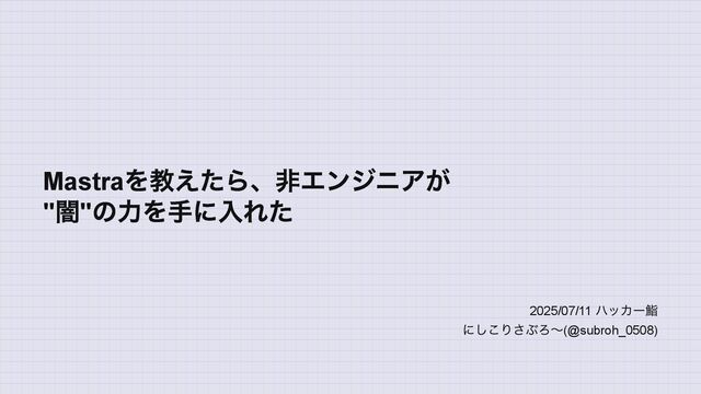 Mastra を教えたら、非エンジニアが " 闇" の力を手に入れた 2025/07/11 ハッカー鮨 にしこりさぶろ〜(@subroh_0508)