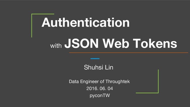 current_identity from werkzeug.security import safe_str_cmp 41 https://pythonhosted.org/Flask-JWT/ pip install Flask-JWT class User(object): def __init__(self, id, username, password): self.id = id self.username = username self.password = password def __str__(self): return "User(id='%s')" % self.id users = [ User(1, 'user1', 'abcxyz'), User(2, 'user2', 'abcxyz'), ] username_table = {u.username: u for u in users} userid_table = {u.id: u for u in users} Minimum viable application configuration: