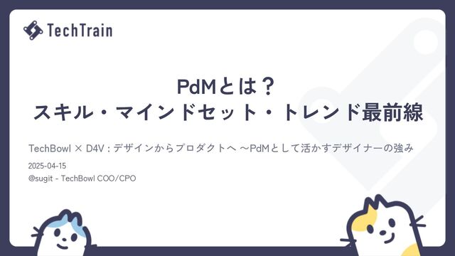 Title: 「PdMとは? スキル・マインドセット・トレンド最前線」 | デザインからプロダクトへ 〜PdMとして活かすデザイナーの強み Event: TechBowl × D4V : デザインからプロダクトへ 〜PdMとして活かすデザイナーの強み URL: https://techtrain.connpass.com/event/350365/ Date: 2025/4/15 @Goodpatch